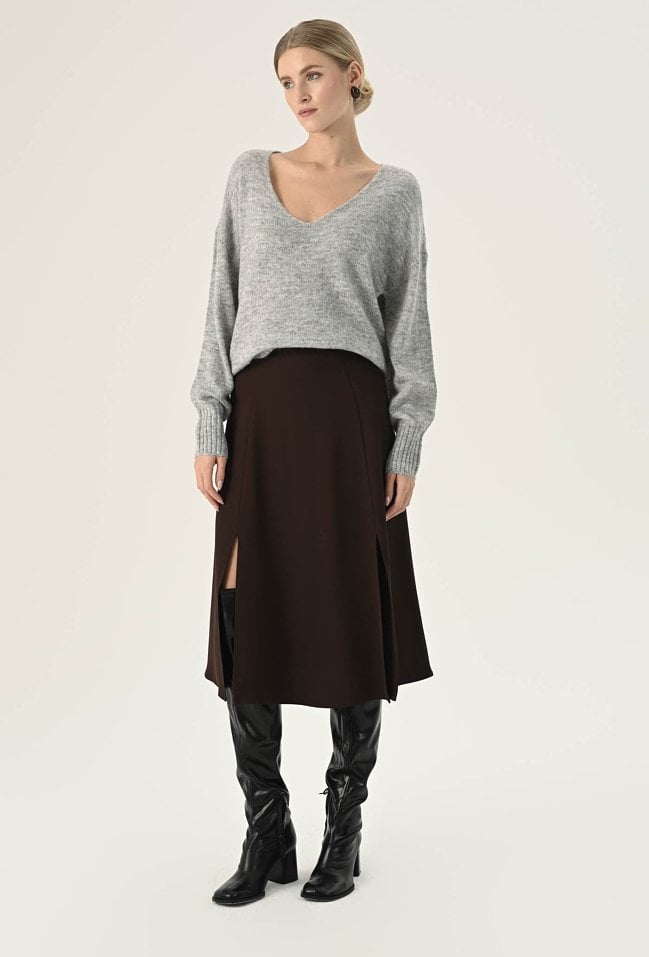 Ponadczasowy sweter z domieszką wełny, o kobiecym kroju z dekoltem w kształcie litery V. Wykonany z miękkiej dzianiny, zapewnia komfort i ciepło. Drobne pęknięcie na dole dodaje lekkości i subtelnego akcentu. Idealny na co dzień i do pracy. Modelka na zdjęciu ma 177 cm wzrostu i prezentuje rozmiar 36/S.