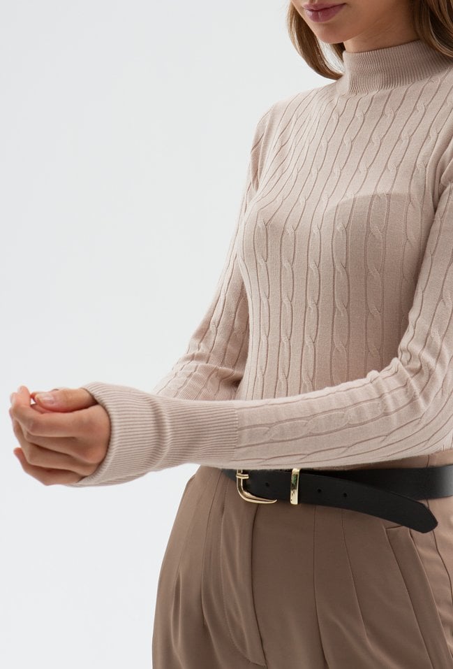 Sweter o dopasowanym kroju z warkoczowym splocie, z przyjemnej w dotyku dzianiny z wiskozy. Sweter posiada półgolf z długimi rękawami i występuje w dwóch kolorach. Świetnie sprawdzi się w zestawie z jeansami. Modelka na zdjęciu ma 178 cm wzrostu i prezentuje rozmiar 36.
