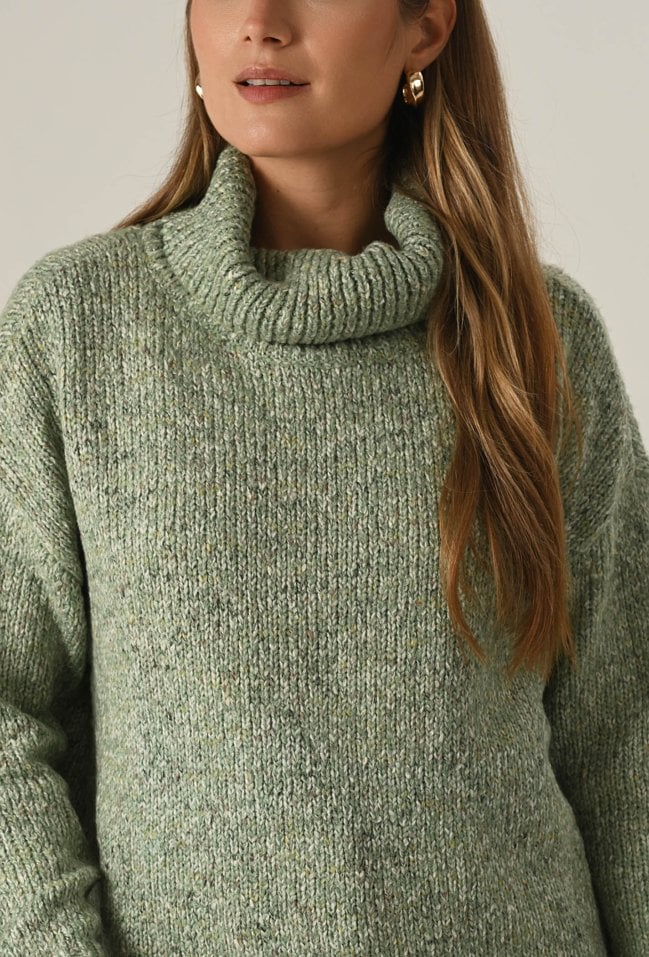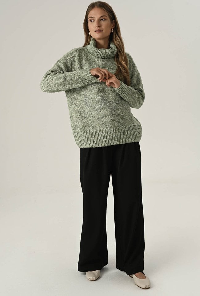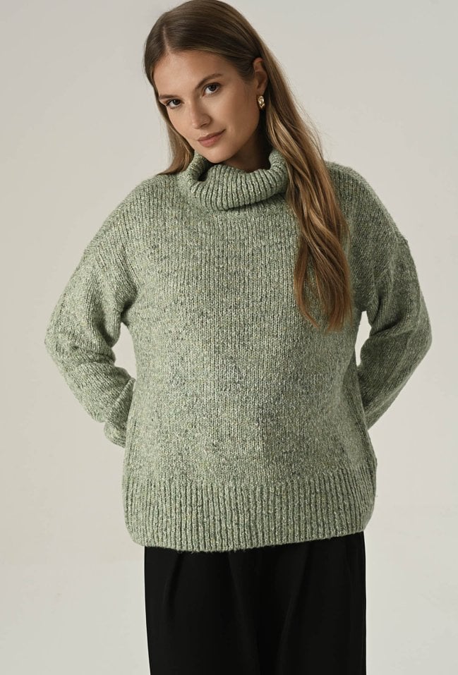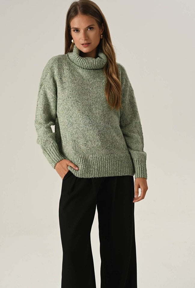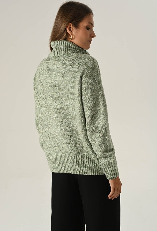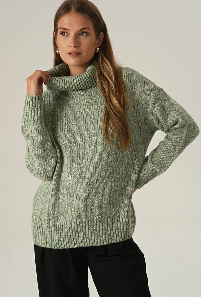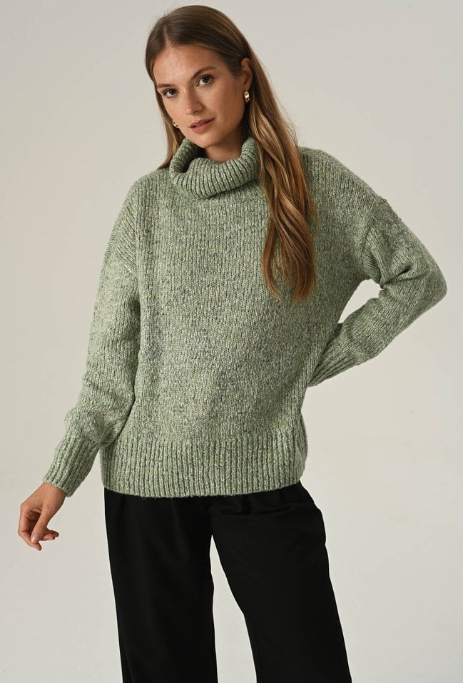 Miękki i przyjemny w dotyku sweter damski o klasycznym kroju, wykonany z efektownej melanżowej przędzy. Duży, otulający golf nie tylko chroni przed chłodem, ale też nadaje całości eleganckiego, swobodnego charakteru. Idealny wybór na zimniejsze dni – zapewnia komfort, ciepło i modny wygląd w jednym. Modelka na zdjęciu ma 177 cm wzrostu i prezentuje rozmiar 36/S.