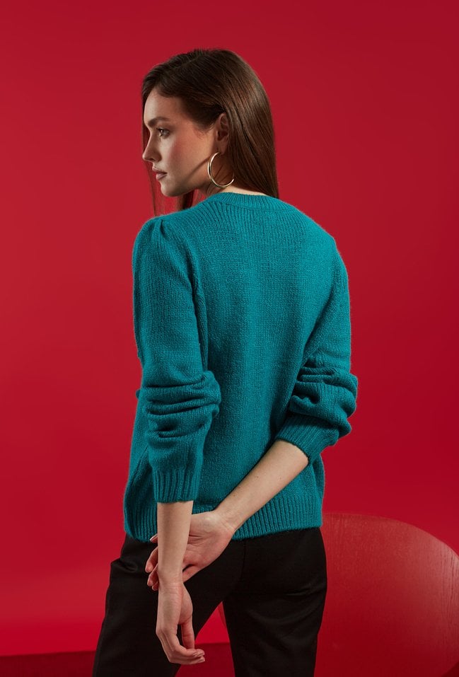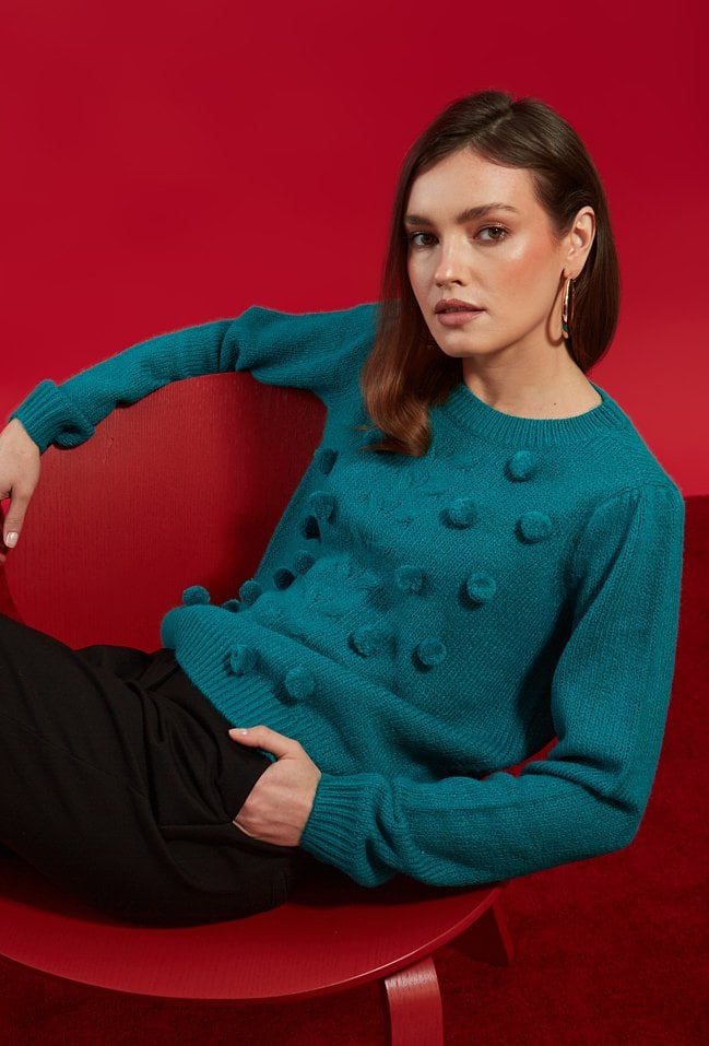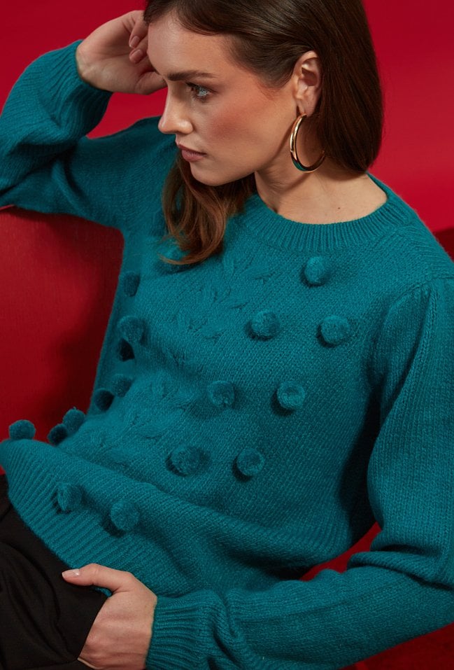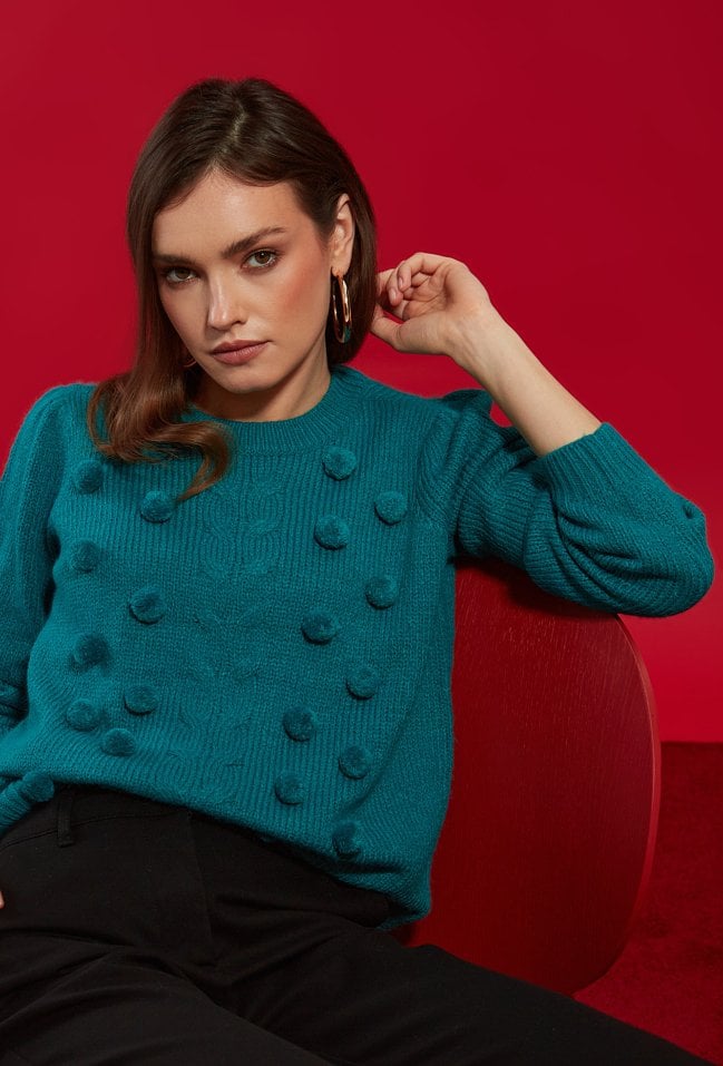 Zielony sweter o luźnym fasonie, to idealna propozycja do codziennej stylizacji. Ładnie prezentuje się na sylwetce. Sweter wykończony jest ściągaczem natomiast front urozmaicają ozdobne kulki. Modelka na zdjęciu ma 175 cm wzrostu i prezentuje rozmiar S.