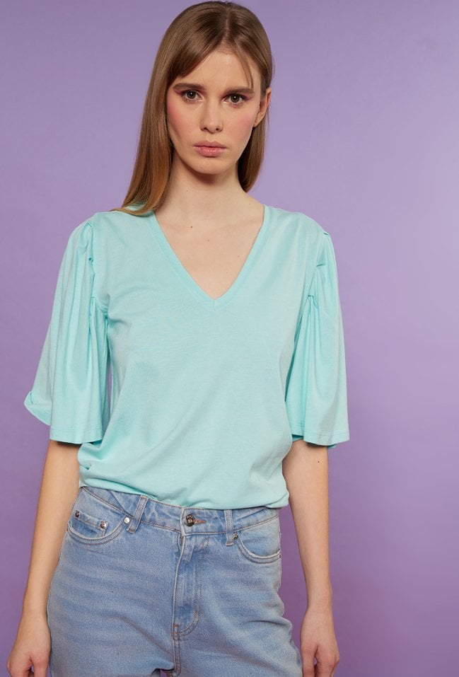 Gładki t-shirt to z pewnością must-have, który powinien znaleźć się w każdej szafie! T-shirt z krótkimi, szerokimi rękawami oraz dekoltem w serek świetnie sprawdzi się jako baza do codziennych stylizacji. Modelka na zdjęciu ma 178cm wzrostu i prezentuje rozmiar 36.