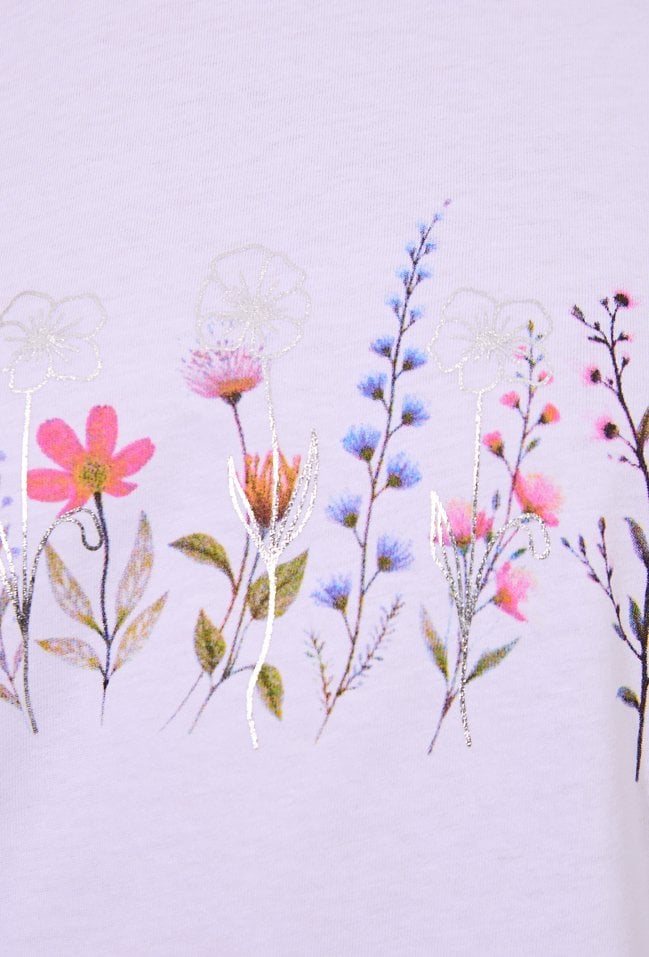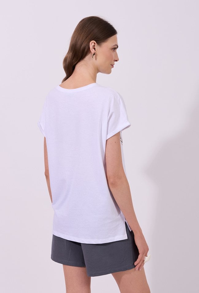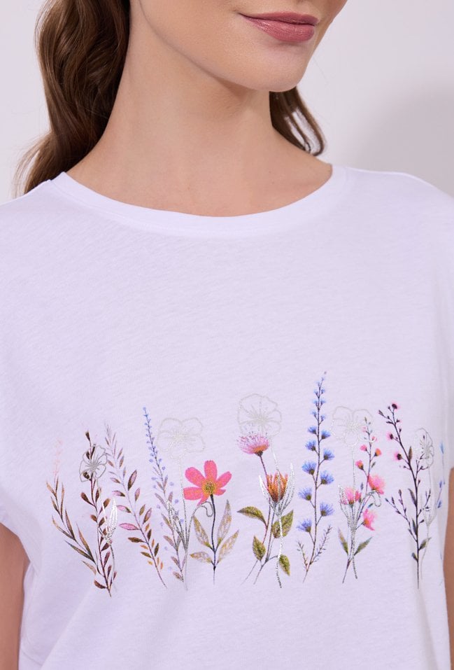 T-shirt damski o luźnym, komfortowym kroju z krótkim rękawem. Model z klasycznym, półokrągłym dekoltem. Z przodu znajduje się delikatny nadruk z motywem roślinnym, dodający stylizacji lekkości i kobiecego uroku. Modelka na zdjęciu ma 177 cm wzrostu i prezentuje rozmiar S.