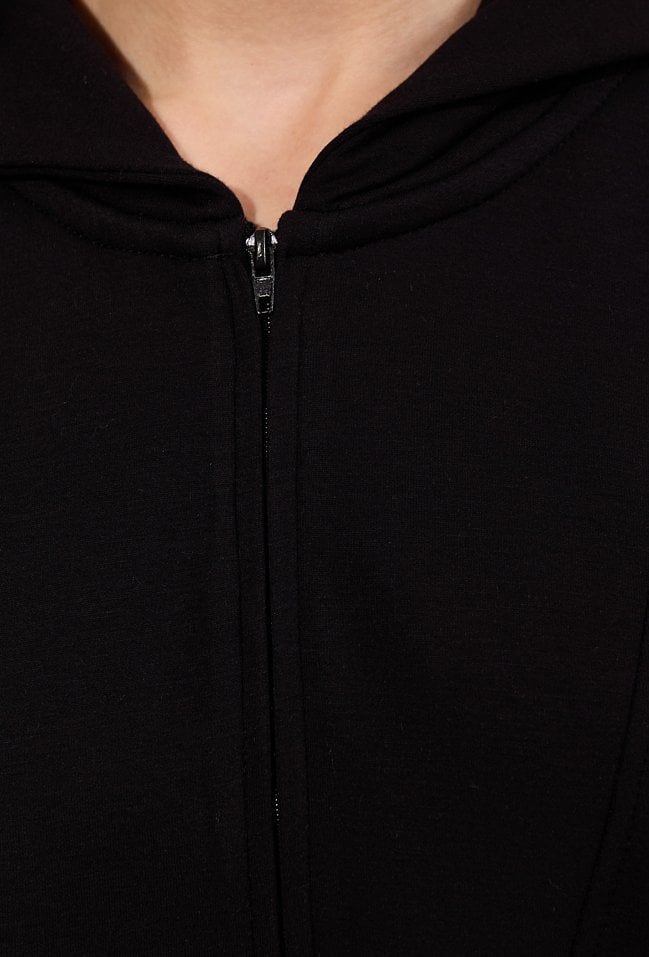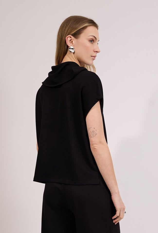 T-shirt damski o luźnym kroju z krótkim rękawem. Model z kapturem oraz krótkim zamkiem przy dekolcie, który nadaje całości sportowego charakteru. T-shirt doskonale sprawdzi się w codziennych i casualowych stylizacjach, zapewniając komfort i wygodę noszenia. Modelka na zdjęciu ma 177 cm wzrostu i prezentuje rozmiar S.