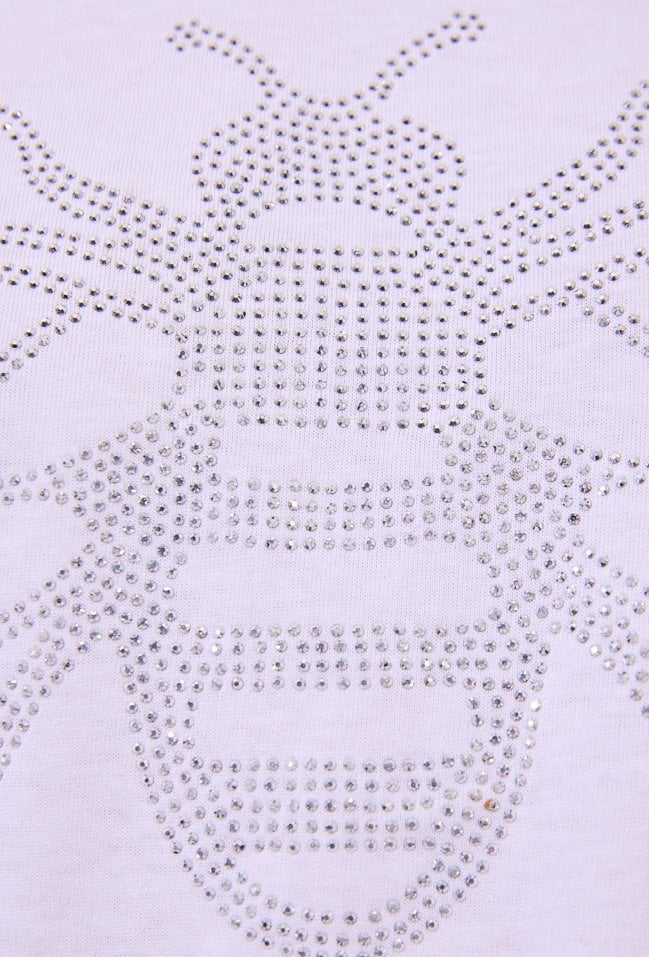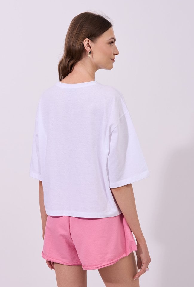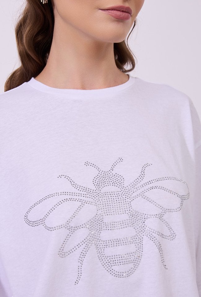 T-shirt damski o luźnym, oversize’owym kroju z krótkim, szerokim rękawem. Model z klasycznym, półokrągłym dekoltem. Z przodu znajduje się efektowna aplikacja w formie owada, wykonana z drobnych, połyskujących elementów. T-shirt idealny do codziennych stylizacji. Modelka na zdjęciu ma 177 cm wzrostu i prezentuje rozmiar S.