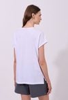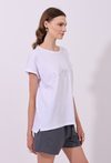 T-shirt damski o luźnym, komfortowym kroju z krótkim rękawem. Model z klasycznym, półokrągłym dekoltem, który nadaje całości uniwersalnego charakteru. Z przodu znajduje się subtelny, połyskujący napis, stanowiący elegancki i minimalistyczny akcent. Lekko wydłużony tył oraz delikatne rozcięcia po bokach zapewniają swobodę noszenia. Modelka na zdjęciu ma 177 cm wzrostu i prezentuje rozmiar S.