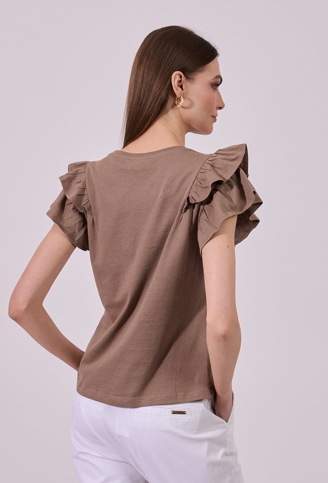T-shirt damski o dopasowanym kroju z krótkim rękawem. Model z klasycznym, okrągłym dekoltem, ozdobiony efektownymi, falbaniastymi rękawami, które nadają całości kobiecego i stylowego charakteru. Modelka na zdjęciu ma 177 cm wzrostu i prezentuje rozmiar S.