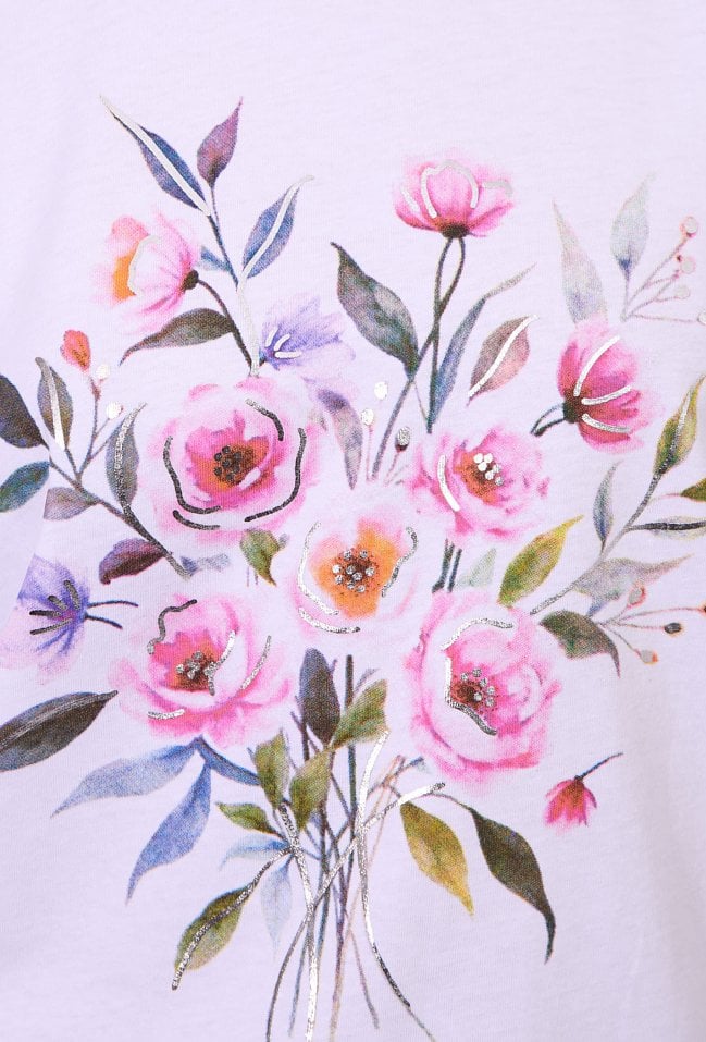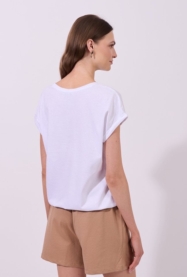 T-shirt damski o luźnym, komfortowym kroju z krótkim rękawem. Model z klasycznym, półokrągłym dekoltem. Z przodu znajduje się subtelny nadruk z motywem kwiatowym, dodający stylizacji lekkości i kobiecego uroku. Modelka na zdjęciu ma 177 cm wzrostu i prezentuje rozmiar S.