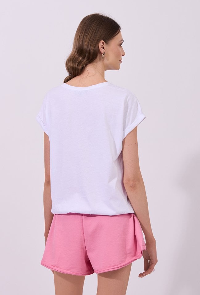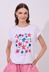 T-shirt damski z klasycznym, półokrągłym dekoltem oraz krótkim rękawem. Z przodu znajduje się kolorowy nadruk z motywem kwiatowym, który dodaje stylizacji świeżości i kobiecego uroku. T-shirt idealny do codziennych, letnich stylizacji. Modelka na zdjęciu ma 177 cm wzrostu i prezentuje rozmiar S.