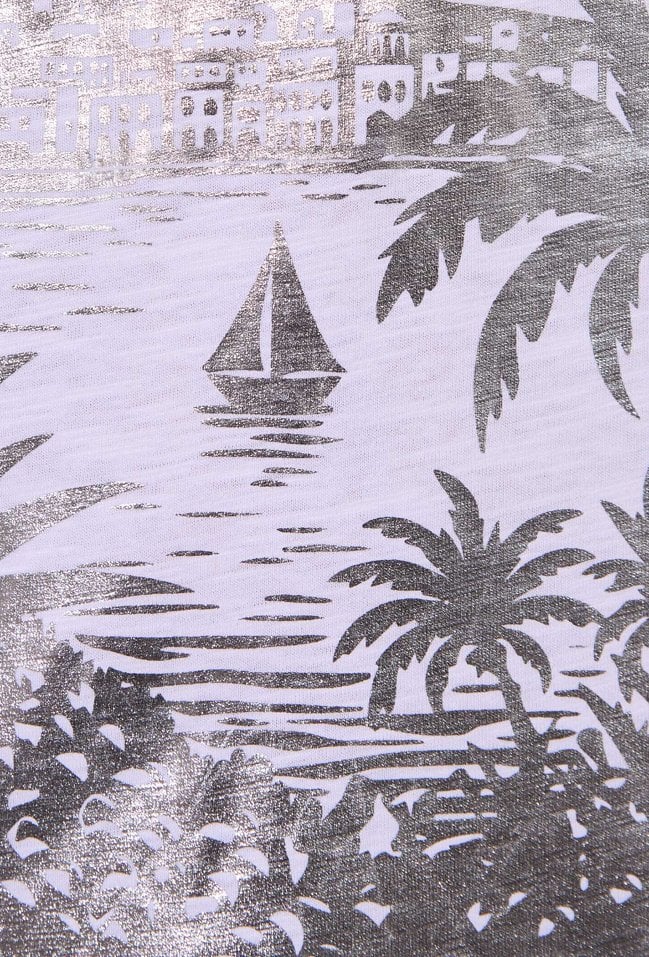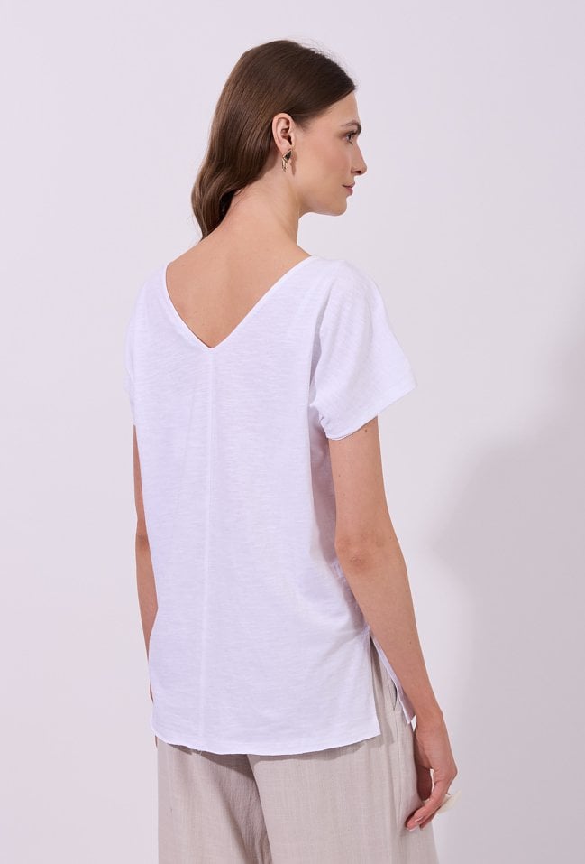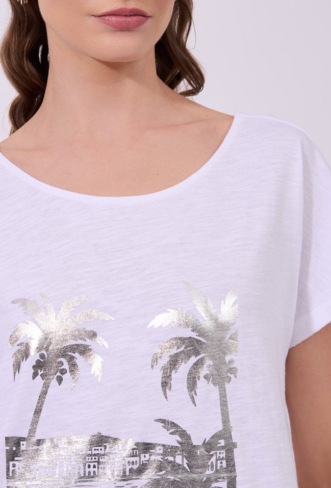 T-shirt damski o luźnym, komfortowym kroju z krótkim rękawem. Model z klasycznym, półokrągłym dekoltem. Z przodu znajduje się efektowny, połyskujący nadruk z motywem krajobrazu, stanowiący stylowy akcent. Lekko wydłużony tył i subtelne rozcięcia po bokach zapewniają swobodę noszenia. T-shirt idealny do codziennych stylizacji. Modelka na zdjęciu ma 177 cm wzrostu i prezentuje rozmiar S.