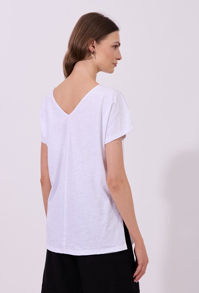 T-shirt damski o luźnym, komfortowym kroju z krótkim rękawem. Model z klasycznym, półokrągłym dekoltem. Z przodu znajduje się nadruk z napisem, stanowiący modny, letni akcent. Modelka na zdjęciu mam 177 cm wzrostu i prezentuje rozmiar S.