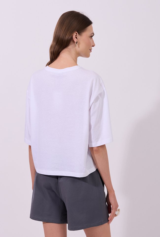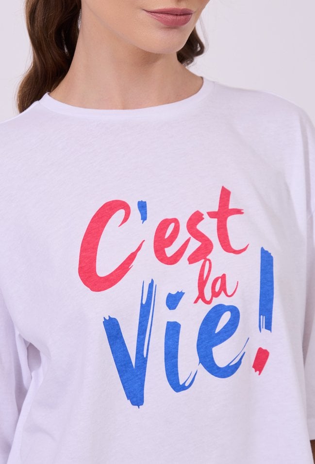 T-shirt damski o luźnym, komfortowym kroju z krótkim rękawem o wydłużonej linii. Model z klasycznym, półokrągłym dekoltem. Z przodu znajduje się wyrazisty nadruk z napisem, stanowiący modny i przyciągający uwagę akcent. T-shirt idealny do codziennych, swobodnych stylizacji. Modelka na zdjęciu ma 177 cm wzrostu i prezentuje rozmiar S.