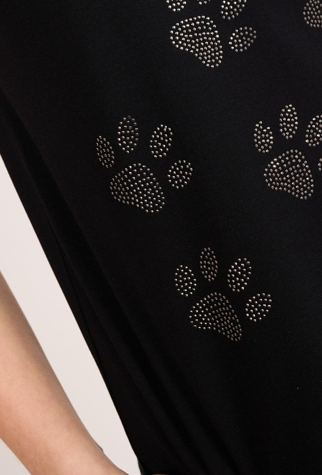 T-shirt damski o luźnym kroju bez rękawów. Model z okrągłym dekoltem oraz ozdobnym nadrukiem w formie łapek, który nadaje całości oryginalnego charakteru. T-shirt doskonale sprawdzi się w codziennych i casualowych stylizacjach, zapewniając komfort i wygodę noszenia. Modelka na zdjęciu ma 177 cm wzrostu i prezentuje rozmiar S.