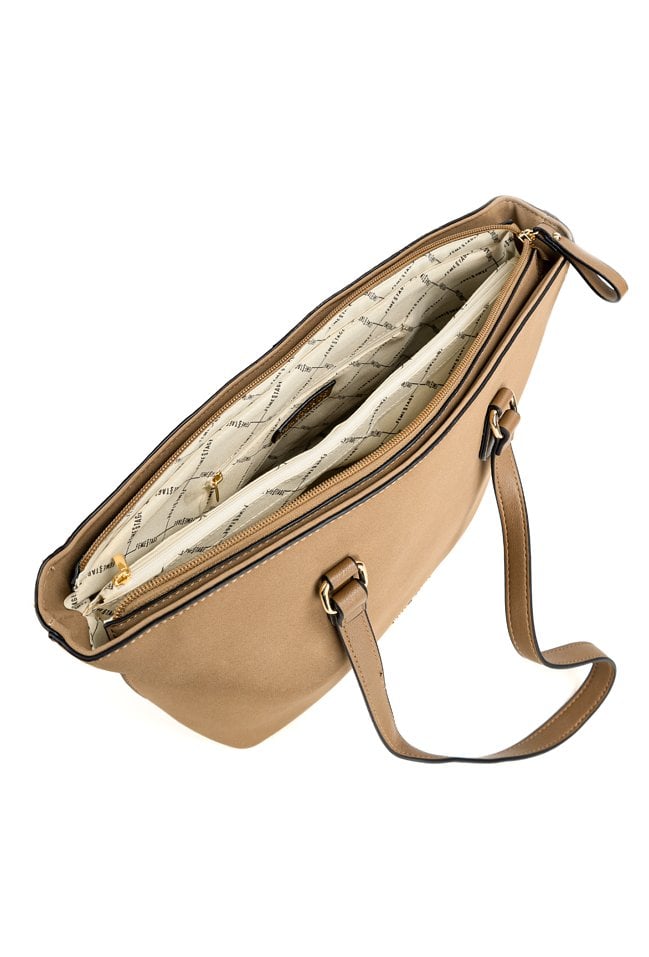 Torba damska typu shopper o wymiarach 39 × 28,5 × 11 cm to klasyczny, pojemny model idealny na co dzień, do pracy i na zakupy. Torba jest jednokomorowa, ma jasną, logowaną podszewkę oraz dodatkowe kieszonki na drobiazgi, które ułatwiają organizację wnętrza. Torba na wygodnych rączkach zapewnia komfort noszenia i pasuje do wielu stylizacji. Torbę należy przechowywać w dołączonym woreczku.