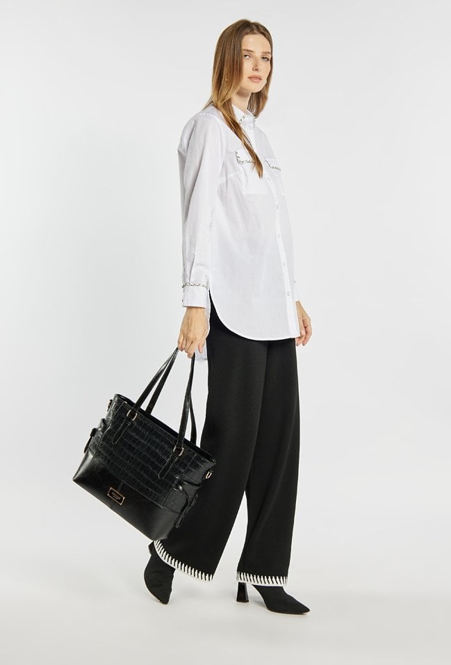 Duża torba damska o wymiarach 40 cm x 29 cm x 13 cm, idealna jako uzupełnienie biurowych stylizacji. Torba jednokomorowa o jasnej, logowanej podszewce z dodatkowymi kieszonkami na drobiazgi. Model zawieszony na wygodnych rączkach, a w zestawie znajduje się również regulowany pasek, który pozwala nosić torbę na ramieniu lub na ukos. Torbę należy przechowywać w dołączonym woreczku.