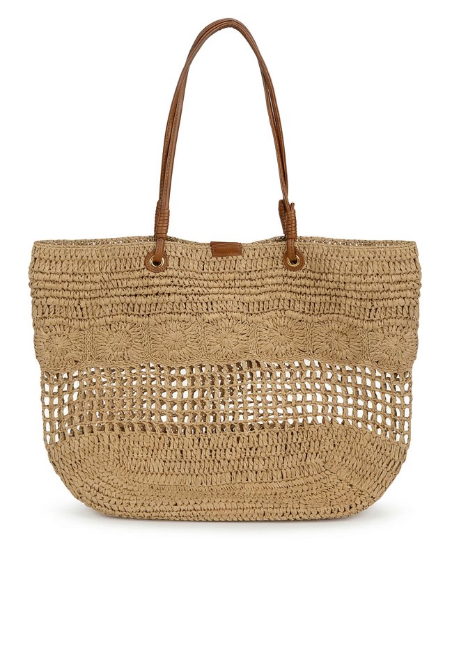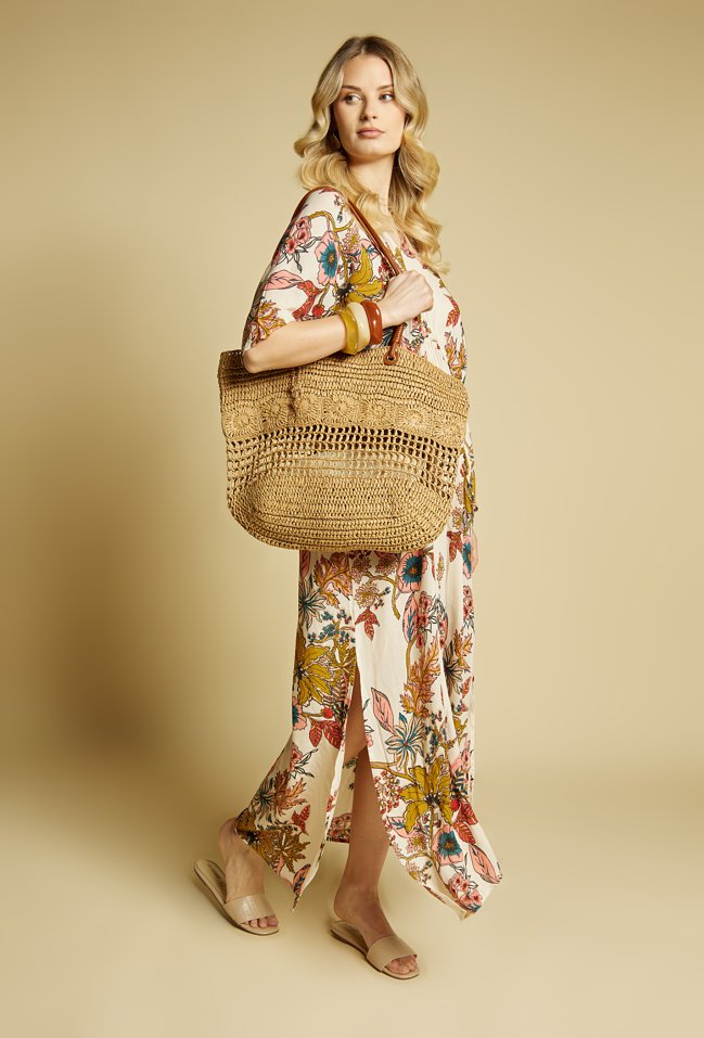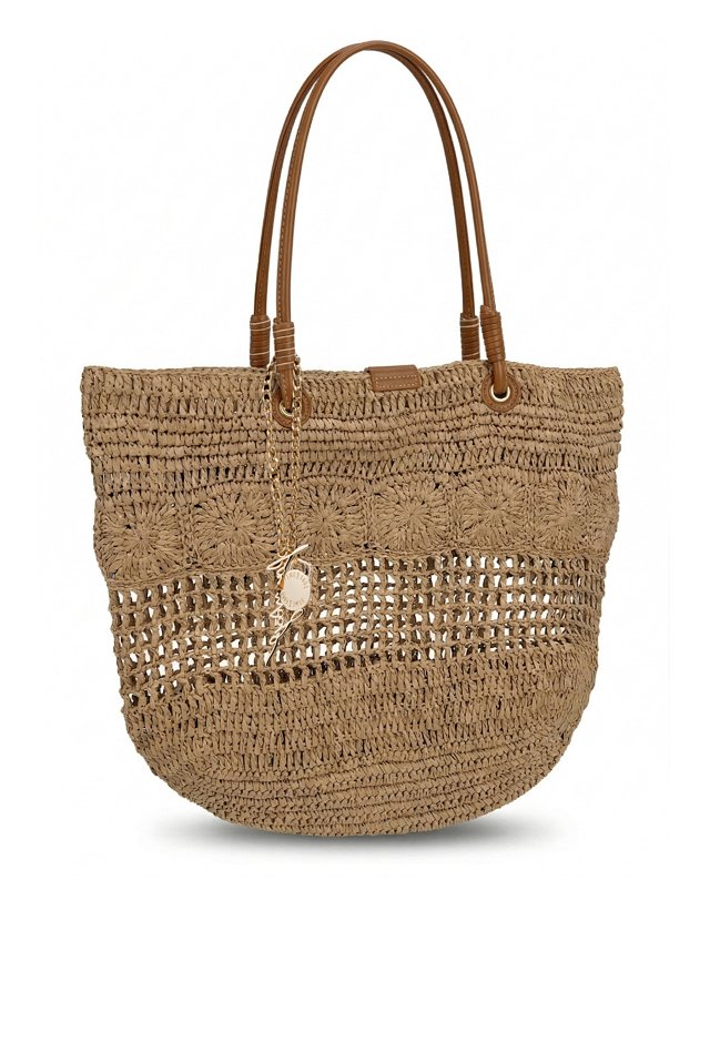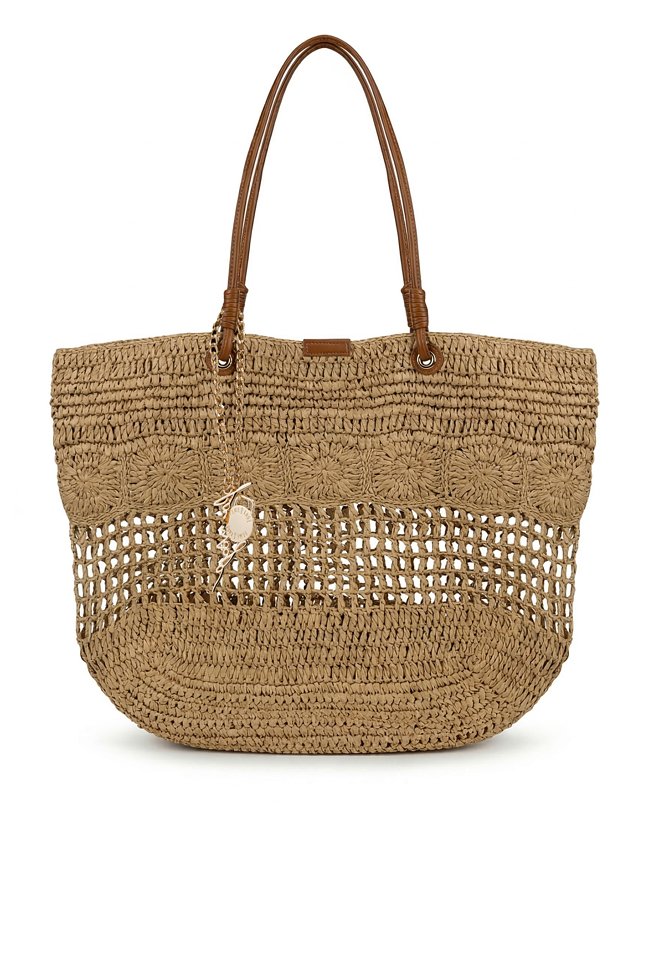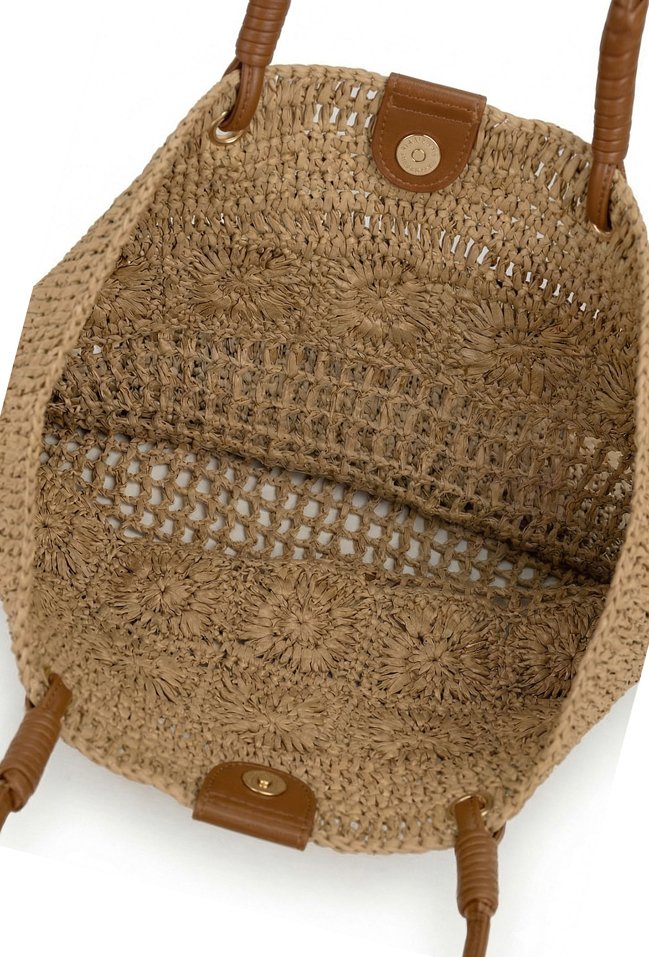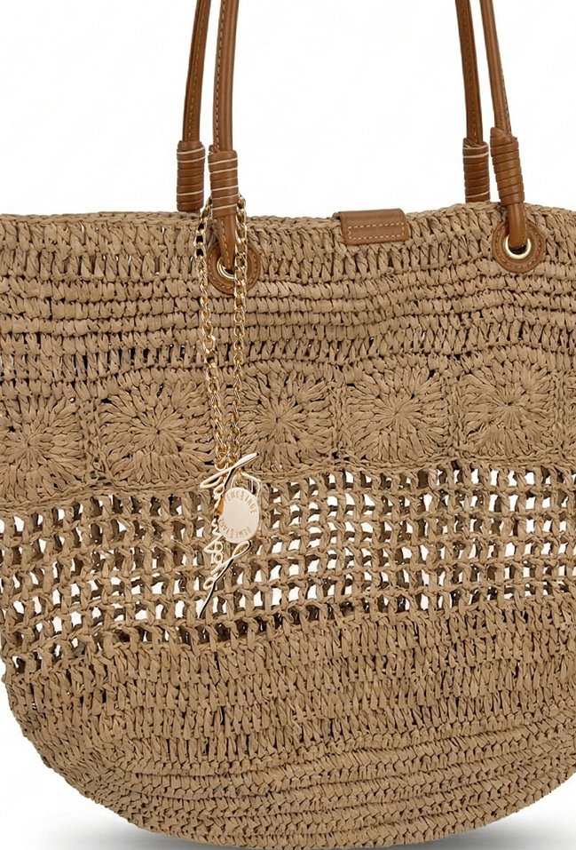 Pleciony koszyk damski, idealny do letnich stylizacji. Jednokomorowy model zapinany na napę, zawieszony na rączkach. Torebkę zdobi łańcuszek z logo marki Femestage. Torbę należy przechowywać w dołączonym woreczku. Wymiary: 45 cm x 38 cm x 11