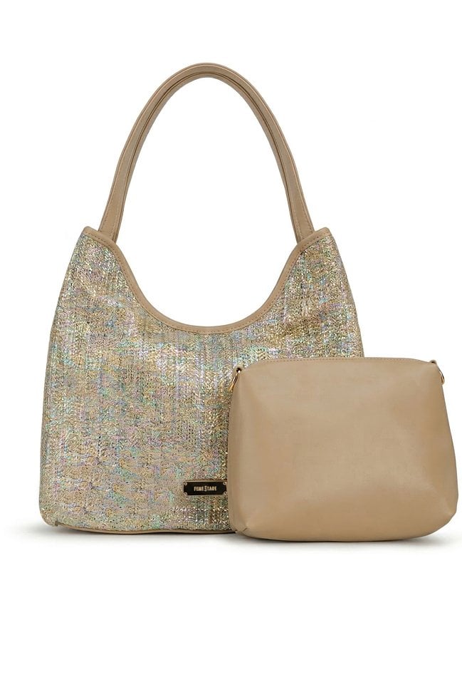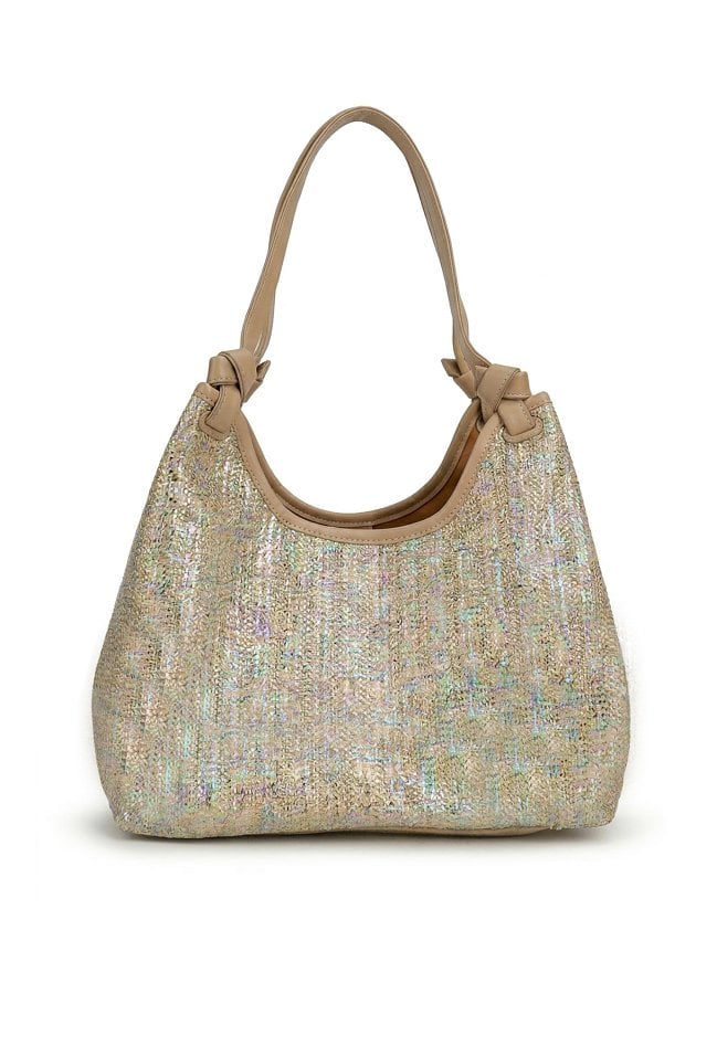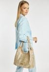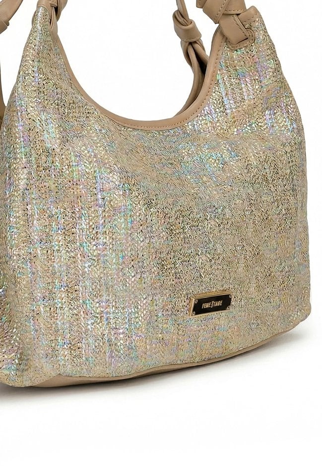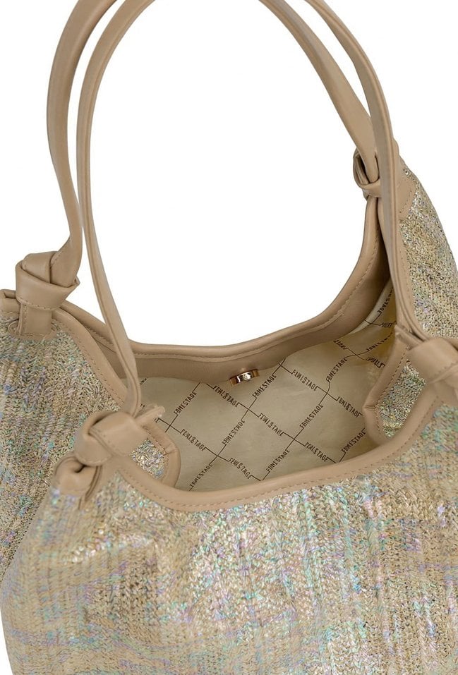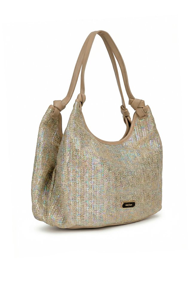 Połyskująca torba damska o wymiarach: 35 cm x 22,5 cm x 14 cm. Torba jednokomorowa o jasnej, logowanej podszewce z dodatkowymi kieszonkami na drobiazgi. Torba zawieszona na wygodnych rączkach. W zestawie znajduje się dodatkowa mała torebka z regulowanym, odpinanym paskiem.