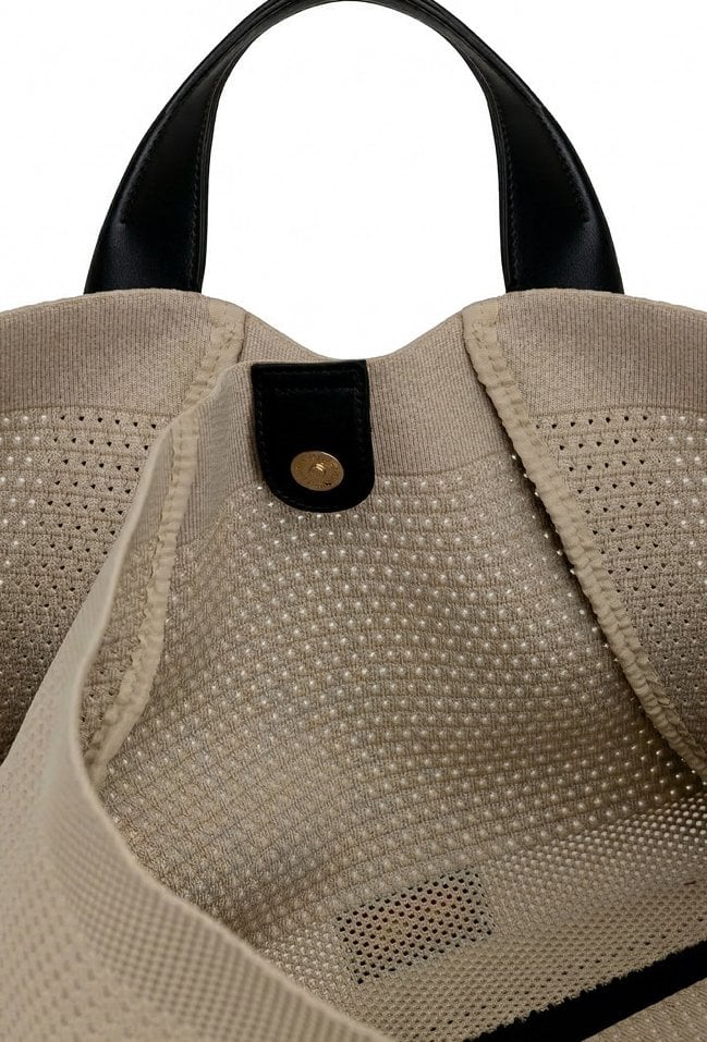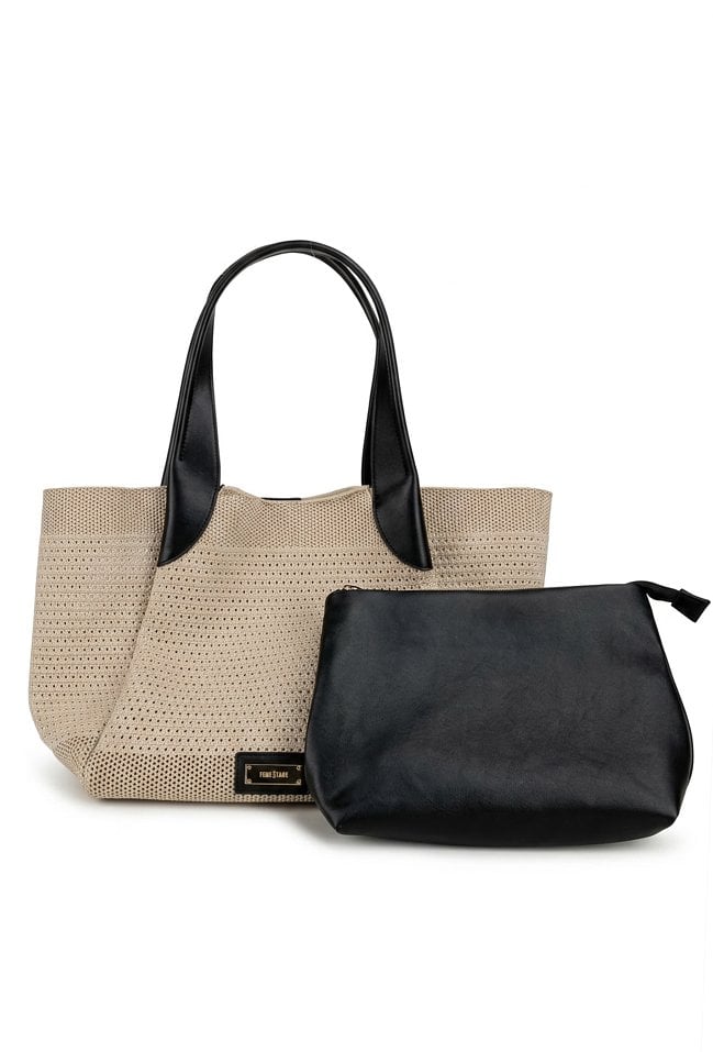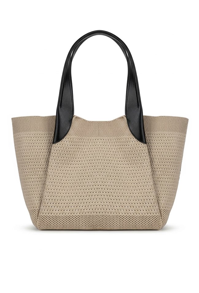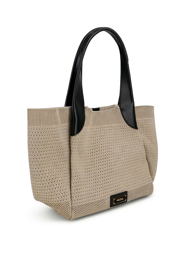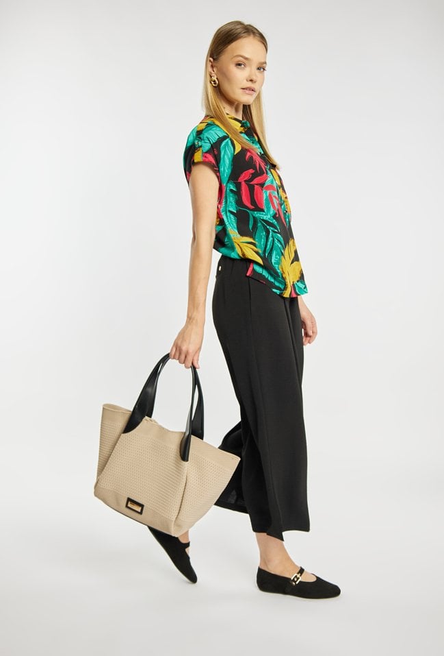 Stylowa torba damska typu shopper z dodatkową małą torebką w środku, idealną na drobne akcesoria. Jedna pojemna komora zapinana na napę oraz wygodne rączki umożliwiają noszenie torby na ramieniu lub w dłoni. Lekka i praktyczna, świetnie sprawdzi się w codziennych oraz letnich stylizacjach. Torbę należy przechowywać w dołączonym woreczku. Wymiary: 46 cm x 30 cm x 14 cm