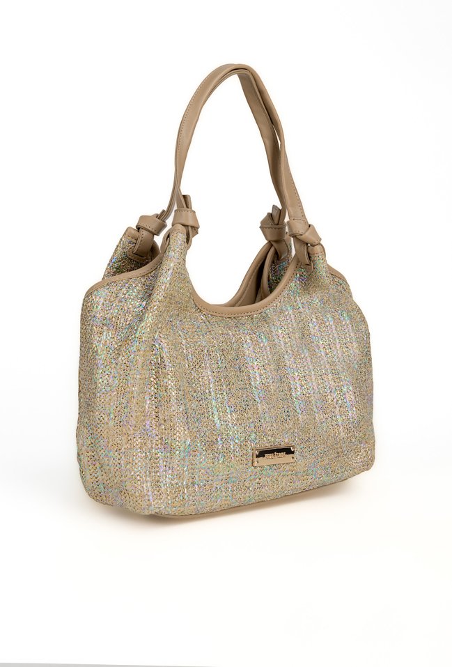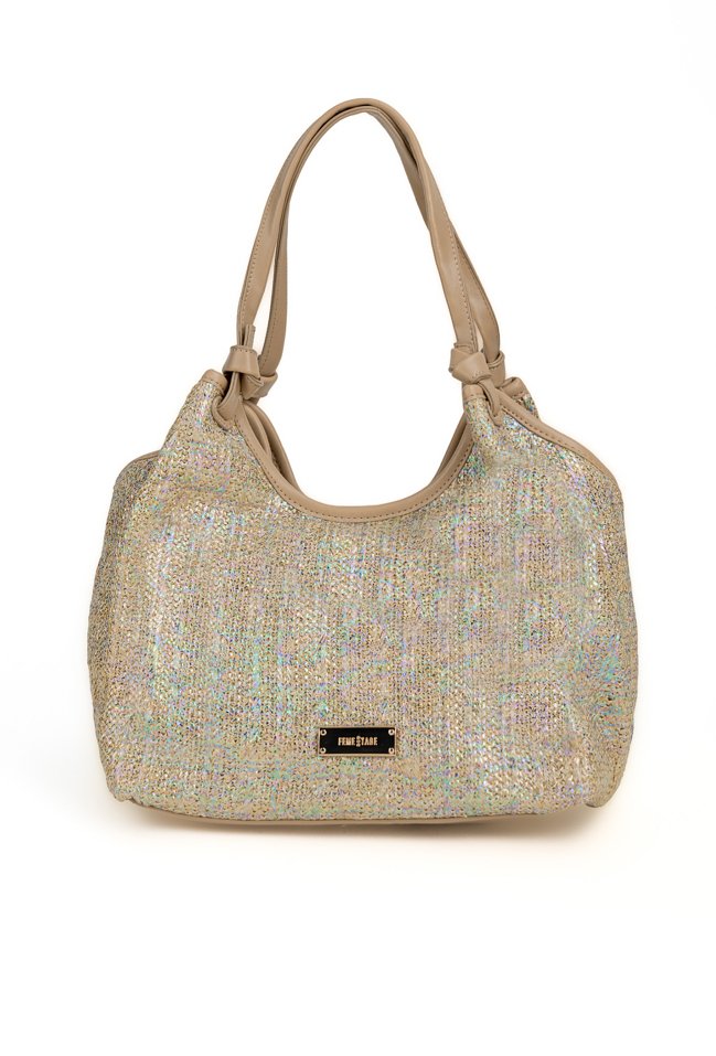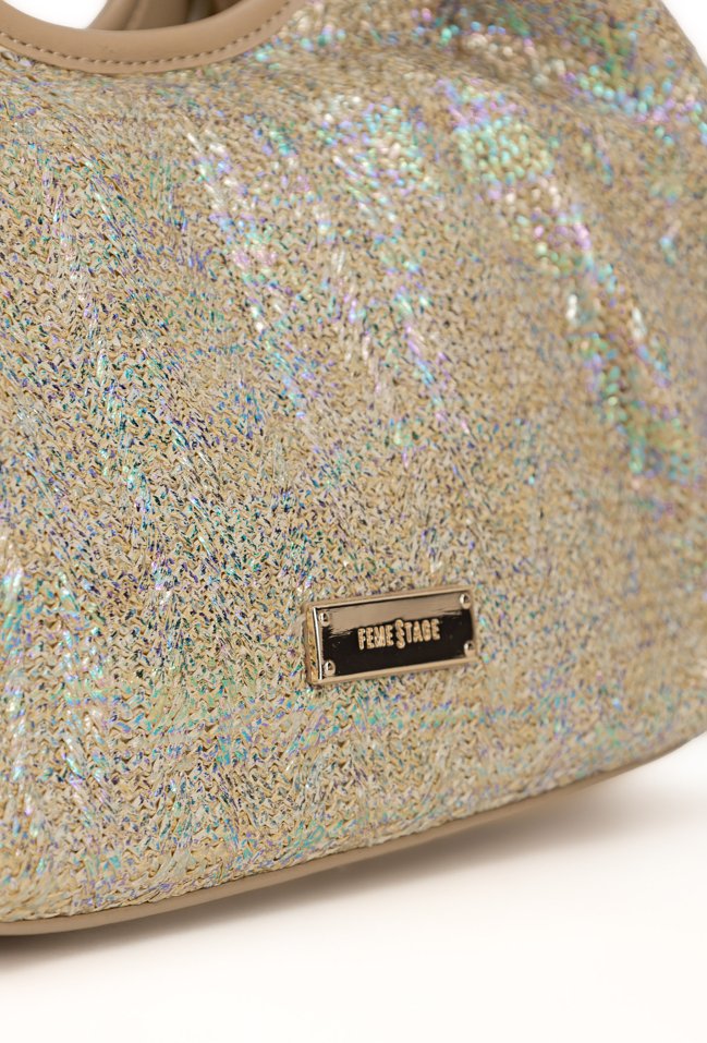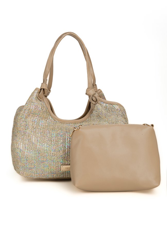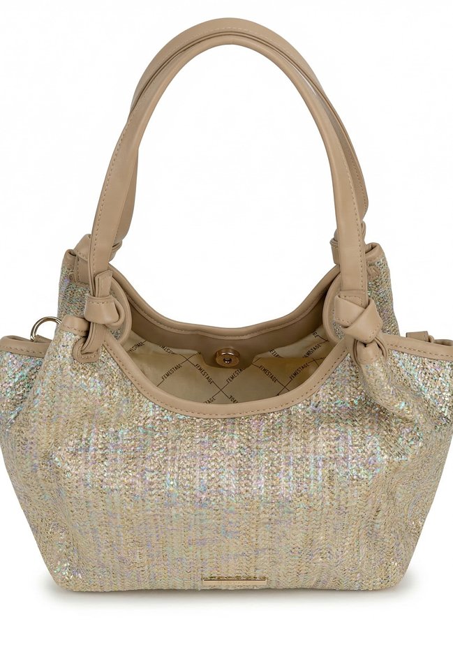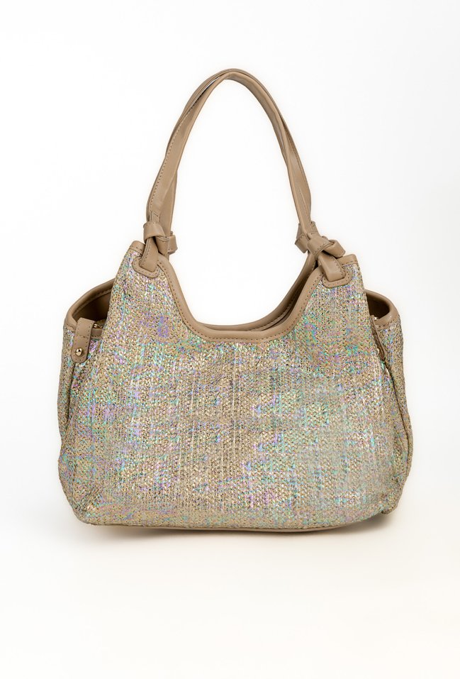 Połyskująca torba damska o wymiarach: 28 cm x 20 cm x 12,5 cm. Torba jednokomorowa o jasnej, logowanej podszewce z dodatkową małą torebką. Torba zawieszona na rączkach. W zestawie regulowany, odpinany pasek, który można przypiąć zarówno do większej, jak i mniejszej torby.