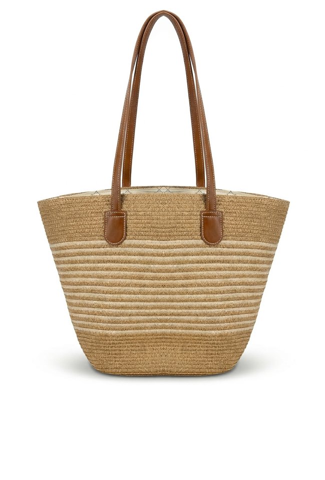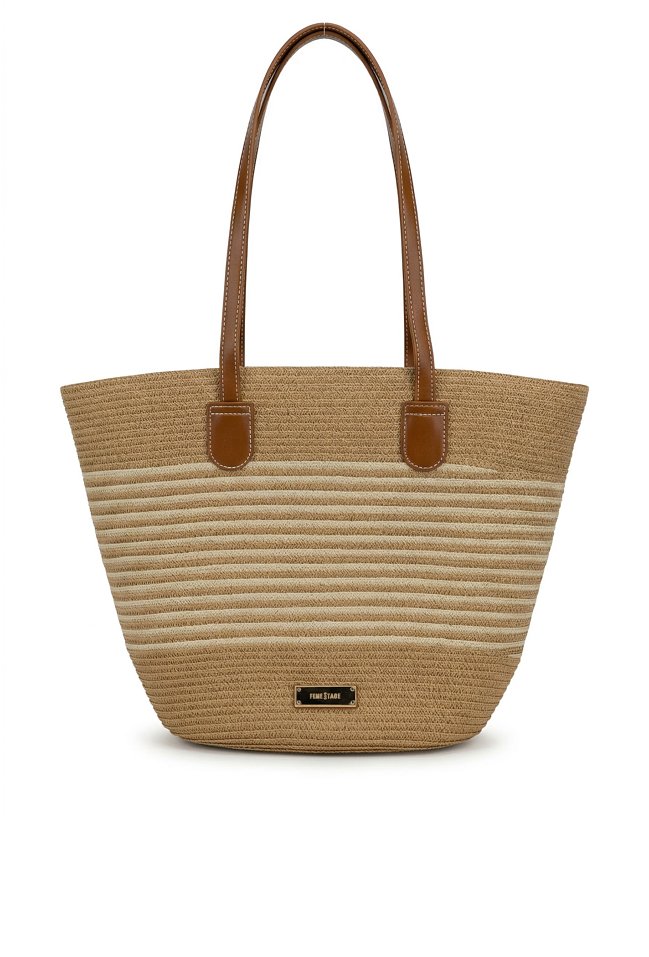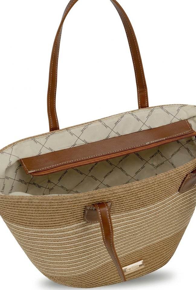 Torba damska typu koszyk, idealna na letnie dni. Jednokomorowy model z jasną, logowaną podszewką. Torba zawieszona na rączkach. Torbę należy przechowywać w dołączonym woreczku. Wymiary: 33,5 cm x 35 cm x 11 cm