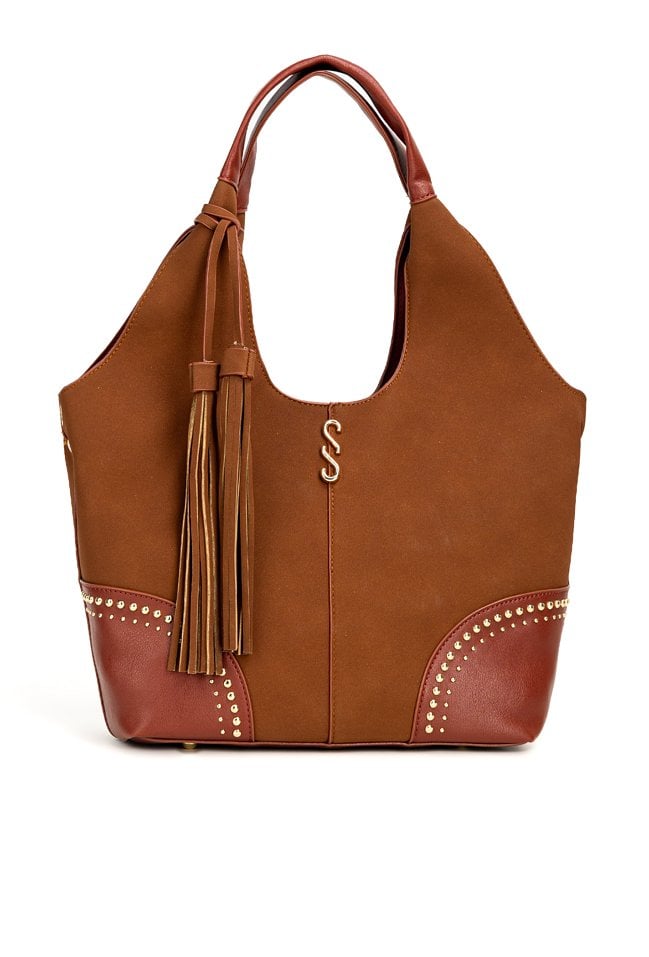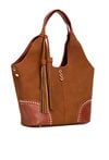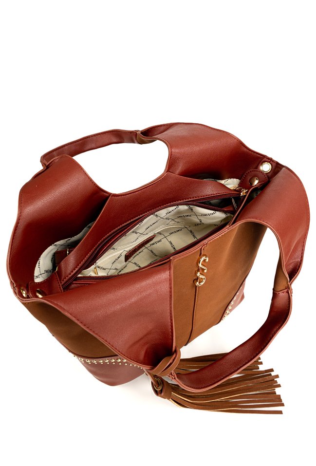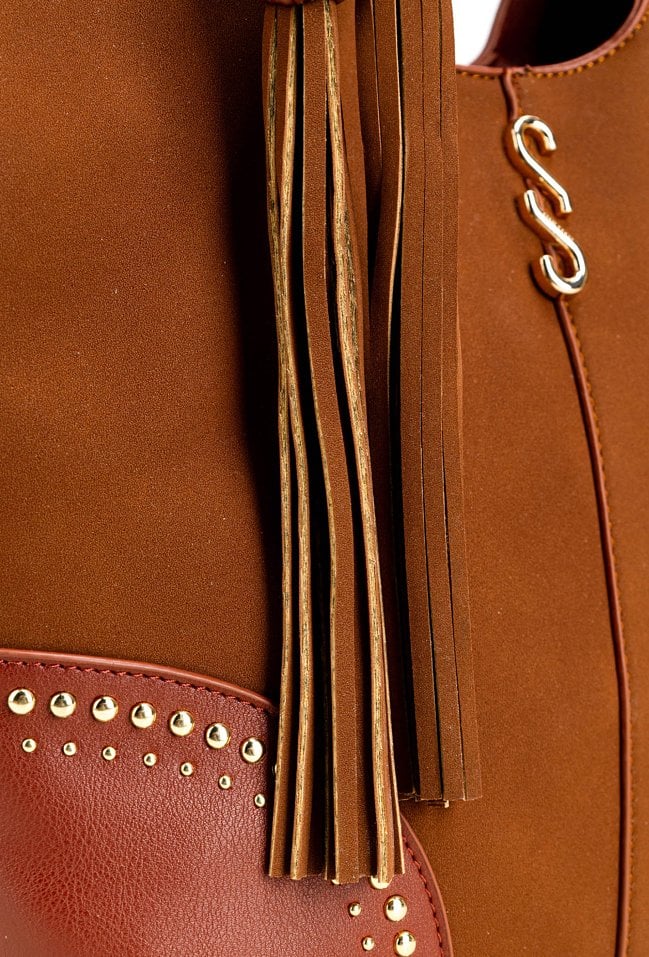 Pojemny shopper damski z dodatkową małą torebką w środku to praktyczny zestaw na co dzień, do pracy i na zakupy. Torba jest jednokomorowa, ma jasną, logowaną podszewkę oraz dodatkowe kieszonki na drobiazgi, które ułatwiają organizację. Torba zawieszona na rączkach wyróżnia się ozdobnymi frędzlami jako dodatkiem, a przód zdobią efektowne ćwieki. Torbę należy przechowywać w dołączonym woreczku. Wymiary torby dużej: 36 × 24,5 × 13 cm, wymiary torby małej: 31 × 22 × 8 cm.