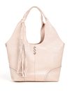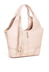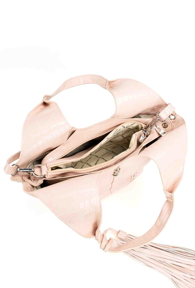 Pojemny shopper damski z dodatkową małą torebką w środku to praktyczny zestaw na co dzień, do pracy i na zakupy. Torba jest jednokomorowa, ma jasną, logowaną podszewkę oraz dodatkowe kieszonki na drobiazgi, które ułatwiają organizację. Torba zawieszona na rączkach wyróżnia się ozdobnymi frędzlami jako dodatkiem, a przód zdobią efektowne ćwieki. Torbę należy przechowywać w dołączonym woreczku. Wymiary torby dużej: 36 × 24,5 × 13 cm, wymiary torby małej: 31 × 22 × 8 cm.
