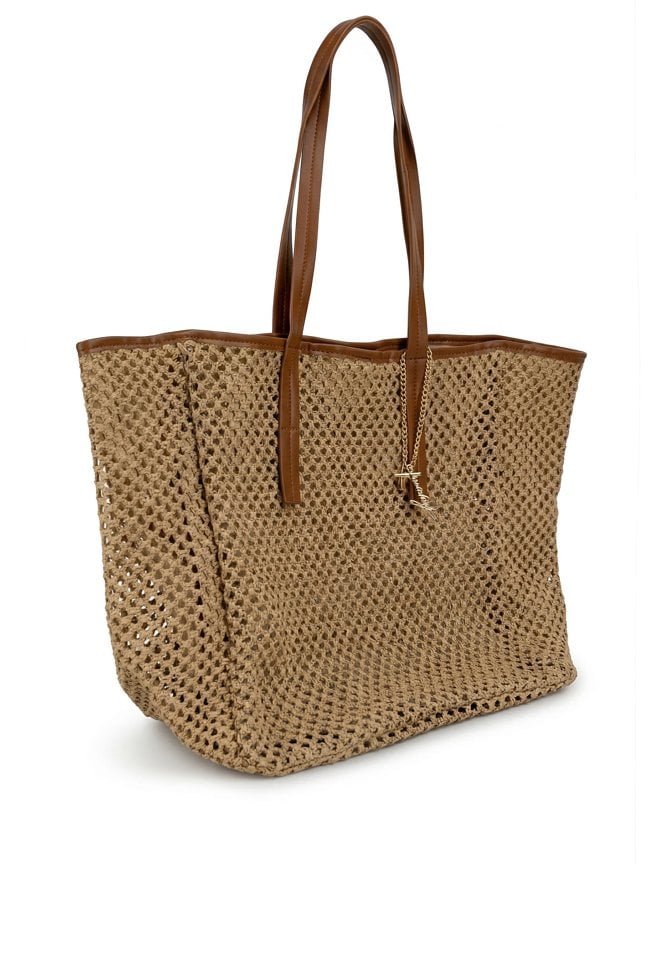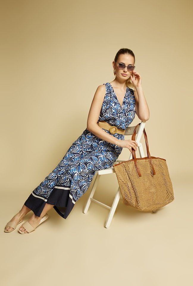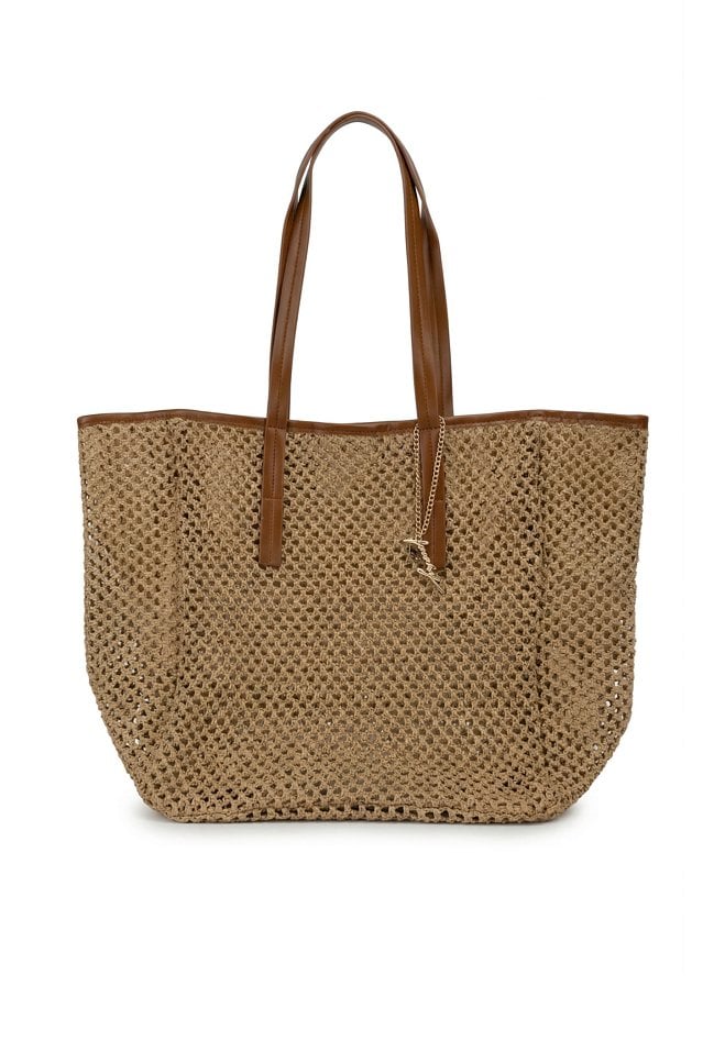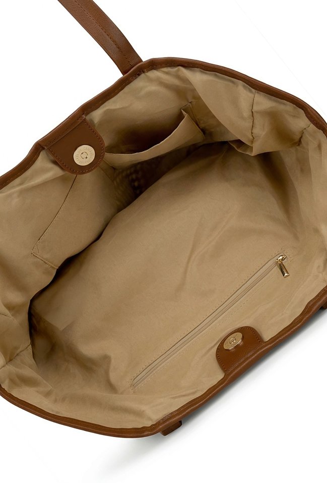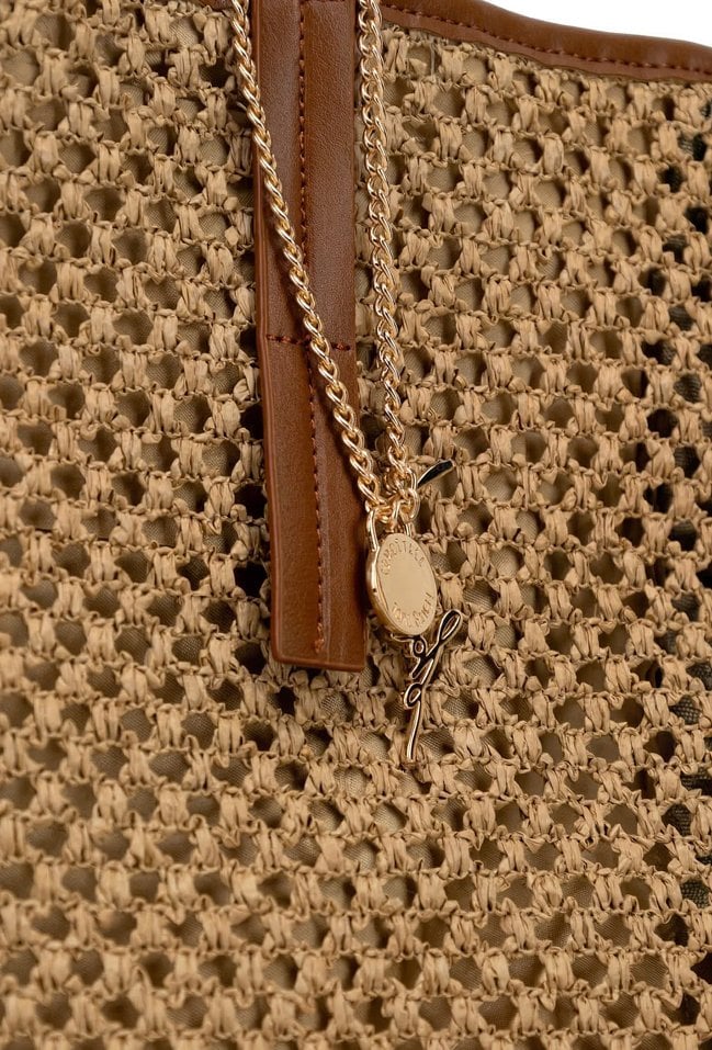 Torba damska o wymiarach 51 × 37 × 18 cm z ozdobną plecionką. Jednokomorowy model z jasną podszewką oraz dodatkowymi kieszonkami na drobiazgi. Torba zapinana na napę, zawieszona na rączkach. Torbę należy przechowywać w dołączonym woreczku.