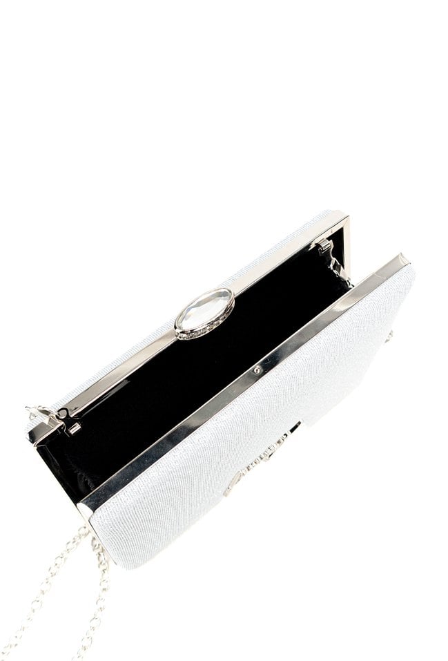 Wizytowa torebka damska z subtelnym połyskiem. Torba wyposażona w jedną komorę wykończoną ciemną podszewką, łączy styl z funkcjonalnością. Model zapinany na praktyczny klips zapewnia bezpieczne przechowywanie zawartości. To elegancki dodatek, który sprawdzi się zarówno na co dzień, jak i podczas wyjątkowych okazji. Torbę należy przechowywać w dołączonym woreczku. Wymiary: 21 cm x 13 cm x 3,5 cm.