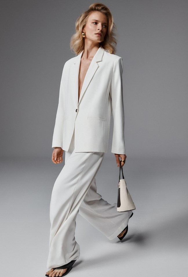 Marynarka damska o klasycznym, eleganckim kroju. Model z długim rękawem oraz kołnierzem z klapami, zapinany na jeden ozdobny guzik. Prosty fason sprawia, że marynarka pięknie układa się na sylwetce i doskonale sprawdza się w wielu stylizacjach. Modelka na zdjęciu ma 177 cm wzrostu i prezentuje rozmiar 36.