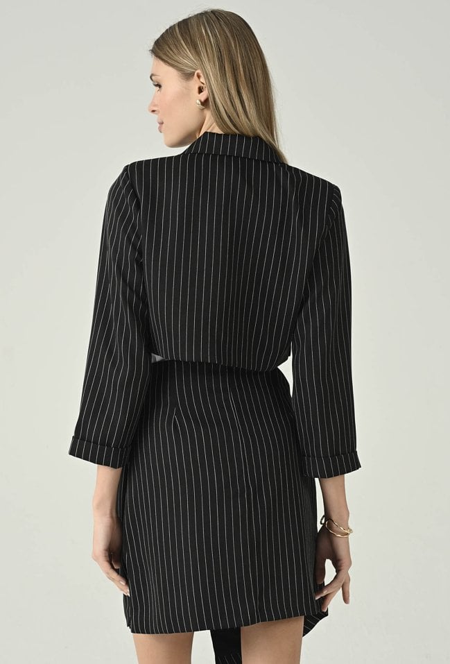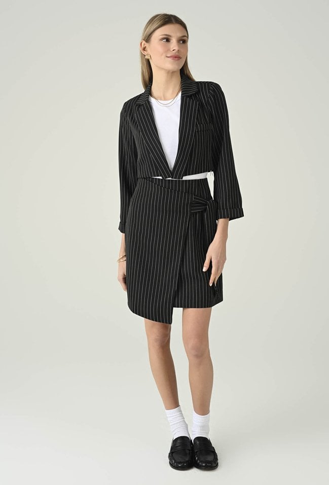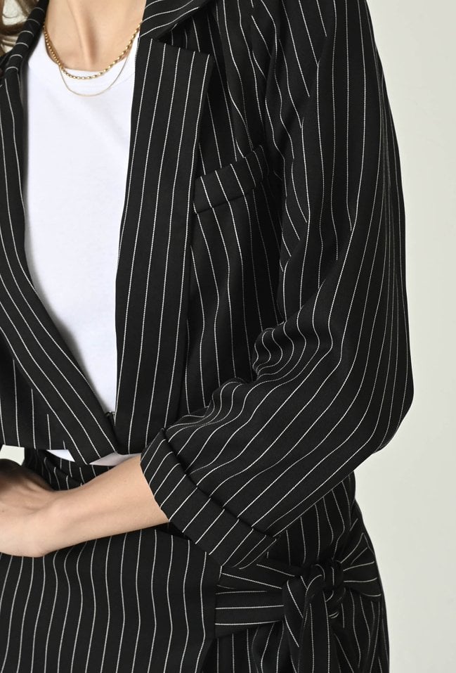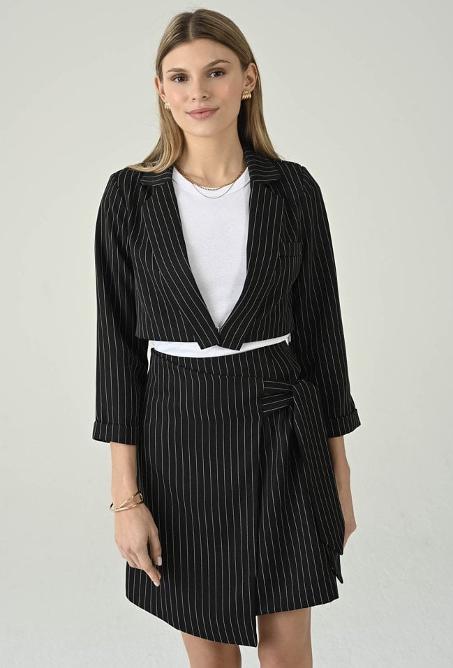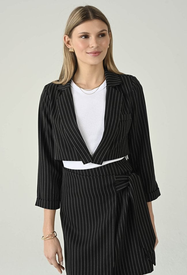 Krótka, elegancka marynarka w klasyczny prążek, która podkreśla szyk każdej stylizacji. Zapinana na napę u dołu, z komfortową, gładką podszewką zapewniającą wygodę noszenia i idealne układanie się materiału. Delikatne poduszki na ramionach subtelnie modelują sylwetkę. Tworzy elegancki zestaw ze spódnicą, świetnie sprawdzając się w biurze, na spotkaniach służbowych i wyjątkowe okazje. Modelka na zdjęciu ma 177 cm wzrostu i prezentuje rozmiar 36.