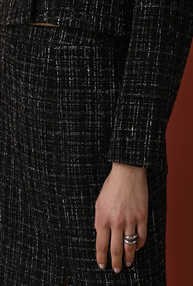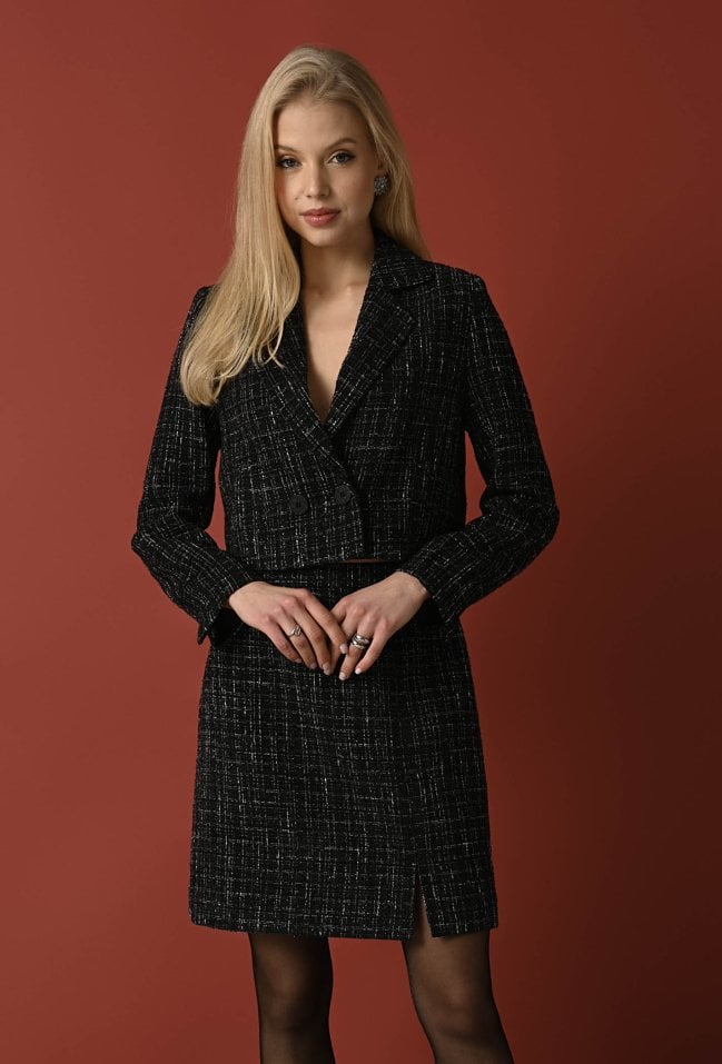 Krótka marynarka o pudełkowym kroju to stylowe, okrycie wierzchnie stworzone z myślą o wyjątkowych okazjach. Dwurzędowe guziki to połączenie klasycznej elegancji i nowoczesnego designu. Wykonana z materiału imitującego tweed, zachwyca swoją strukturą i starannym wykończeniem. Krótszy fason pięknie podkreśla talię i świetnie komponuje się zarówno ze spodniami z wysokim stanem, jak i dopasowaną spódnicą mini z tej samej kolekcji. Modelka ma 177 cm wzrostu i prezentuje rozmiar 36.