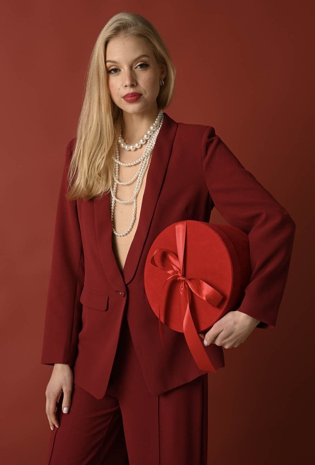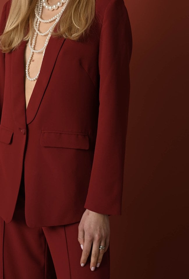 Niezwykle efektowna marynarka w pięknym odcieniu bordo. Posiada klasyczny krój, który z pewnością sprawdzi się zarówno na co dzień, jak i na okazjonalne wyjścia. Marynarka zapinana jest na guzik. Można do niej dobrać garniturowe spodnie z tej samej kolekcji. Modelka na zdjęciu ma 177 cm wzrostu i prezentuje rozmiar 36.