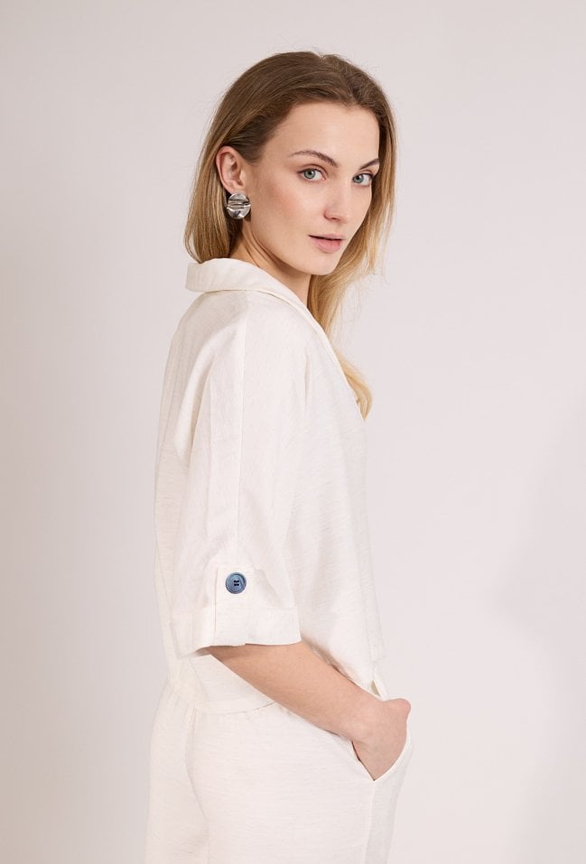 Stylowy żakiet damski o luźnym, krótkim kroju. Model zapinany na guziki z klasycznym kołnierzykiem oraz rękawem o długości 3/4, który nadaje całości lekkiego charakteru. Żakiet doskonale sprawdzi się w eleganckich i codziennych stylizacjach, tworząc modny i uniwersalny element garderoby. Modelka na zdjęciu ma 177 cm wzrostu i prezentuje rozmiar S.