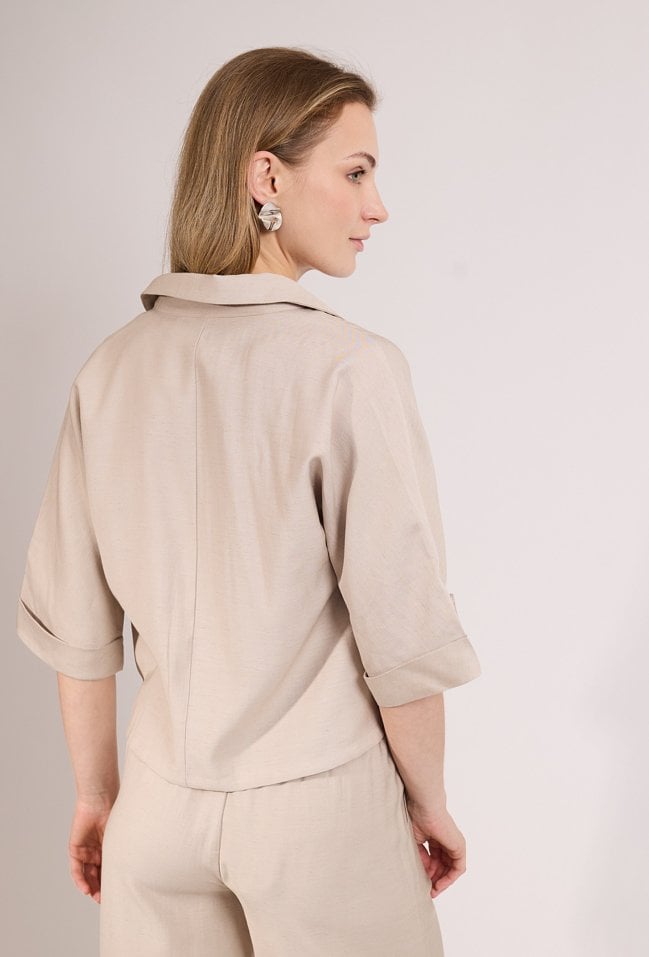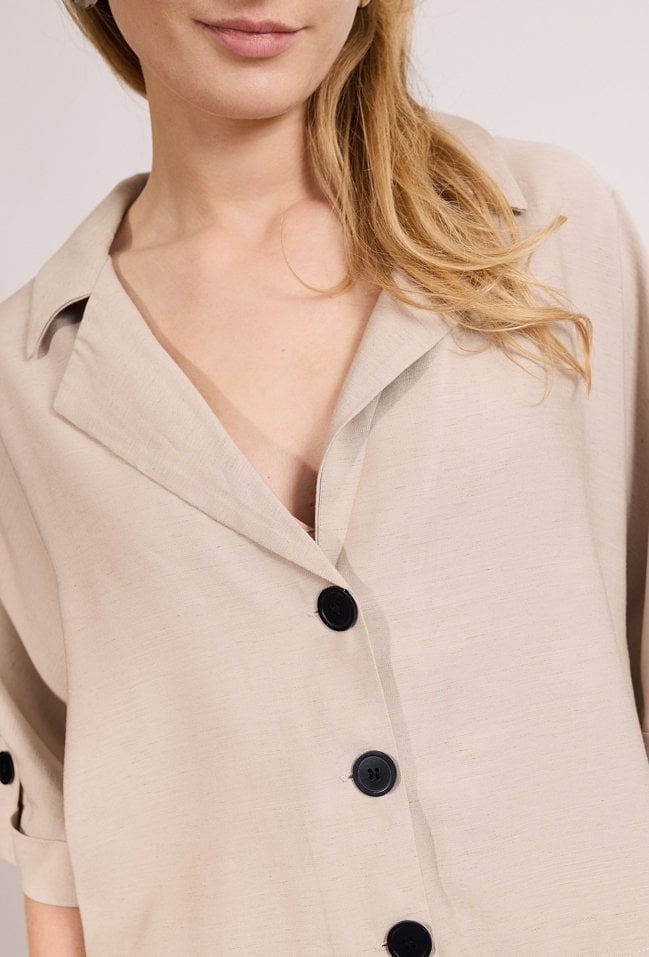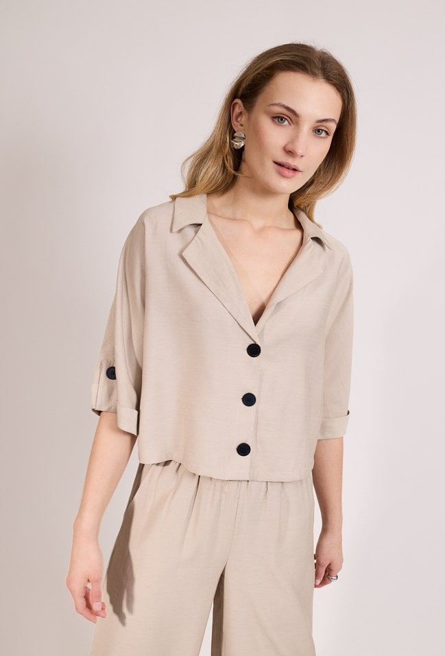 Stylowy żakiet damski o luźnym, krótkim kroju. Model zapinany na guziki z klasycznym kołnierzykiem oraz rękawem o długości 3/4, który nadaje całości lekkiego charakteru. Żakiet doskonale sprawdzi się w eleganckich i codziennych stylizacjach, tworząc modny i uniwersalny element garderoby. Modelka na zdjęciu ma 177 cm wzrostu i prezentuje rozmiar S.