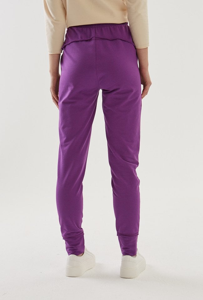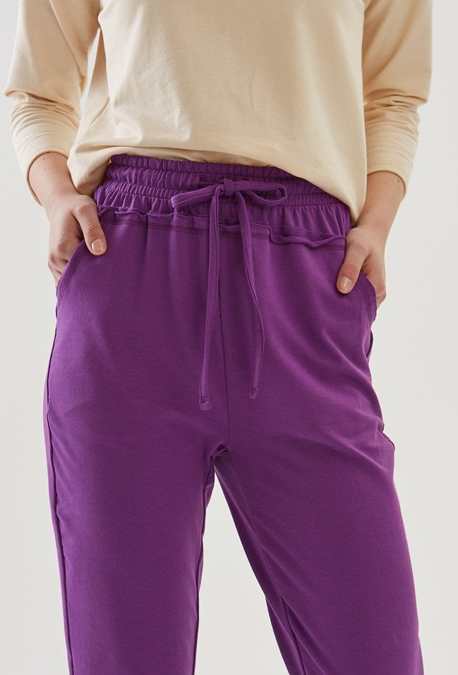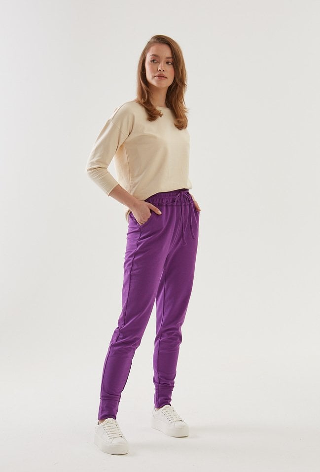 Dresowe spodnie w prostą nogawką wykończone ściągaczem. Spodnie w pasie posiadają elastyczną gumkę oraz wiązanie. Na linii bioder wpuszczone kieszenie. Spodnie występują w komplecie z bluzą z tej samej linii. Modelka na zdjęciu ma 180 cm wzrostu i prezentuje rozmiar S.