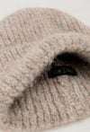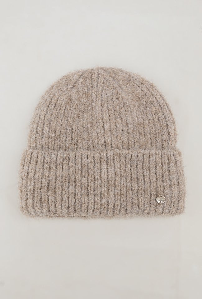 Beżowa czapka ze ściągaczem jest z dodatkiem alpaki i wełny . Czapka pięknie będzie się prezentował przy twarzy. Miękka i przyjemna w dotyku dzianina doskonale dostosowuje się do kształtu głowy.