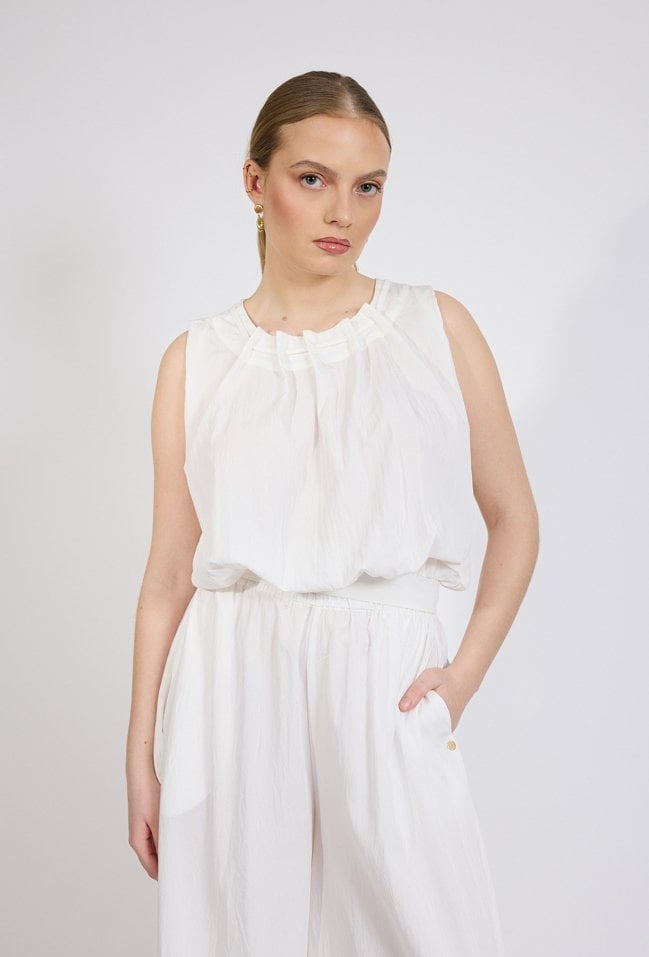 Bluzka damska o lekkim, kobiecym fasonie. Model bez rękawów z okrągłym dekoltem oraz efektownymi marszczeniami przy szyi, które nadają całości subtelnej objętości. Dół bluzki wykończony szerokim ściągaczem, dzięki czemu model pięknie układa się na sylwetce i zapewnia komfort noszenia. Modelka na zdjęciu ma 177 cm wzrostu i prezentuje rozmiar 36.