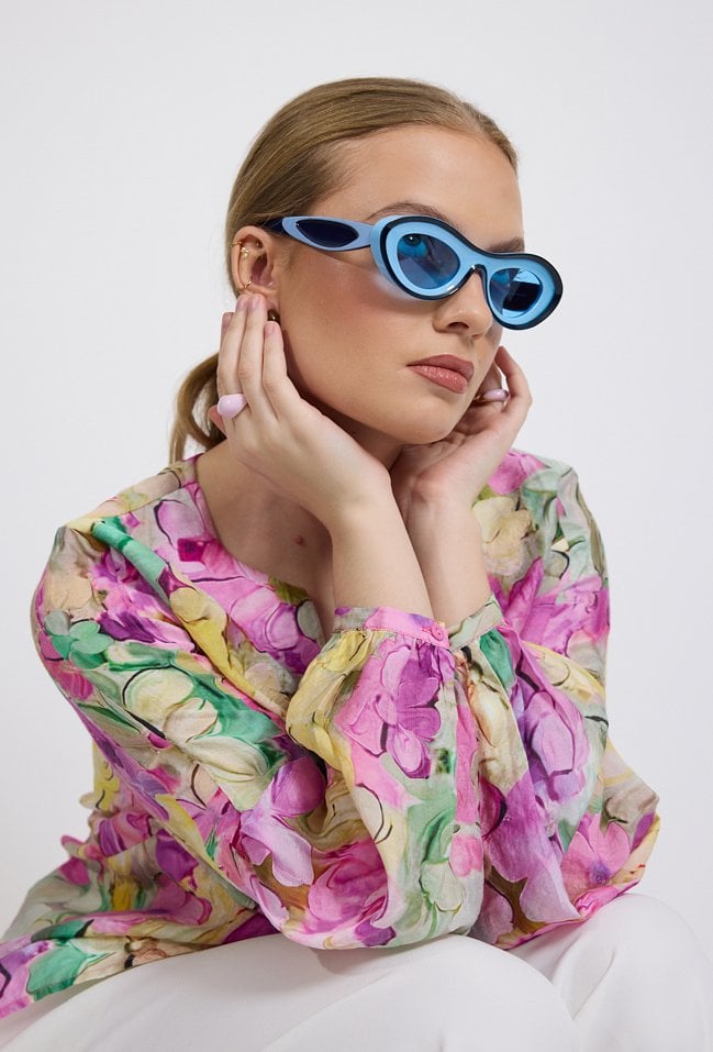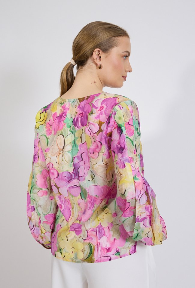 Bluzka damska o lekkim, swobodnym kroju. Model z długim rękawem zakończonym elastycznym mankietem oraz dekoltem w kształcie litery V z subtelnym rozcięciem. Całość zdobi efektowny, kolorowy wzór kwiatowy, który nadaje stylizacji świeżości i kobiecego charakteru. Modelka na zdjęciu ma 177 cm wzrostu i prezentuje rozmiar 36.