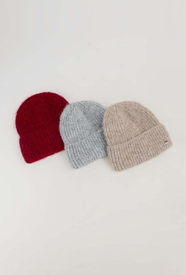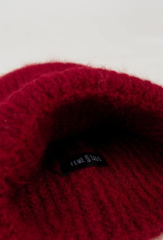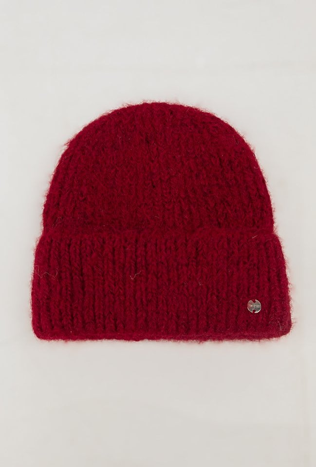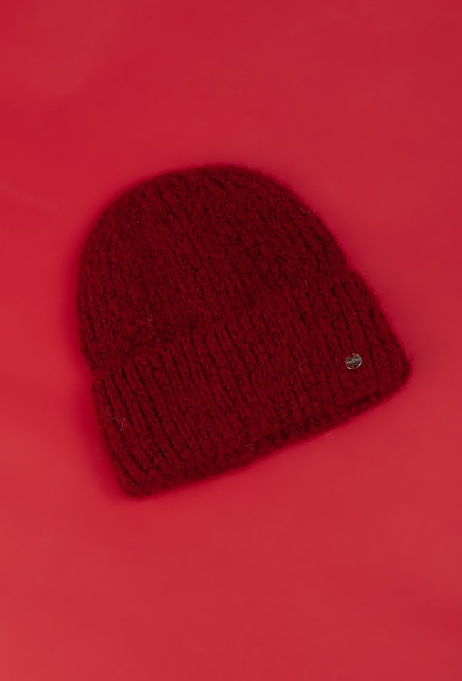 Bordowa czapka ze ściągaczem jest z dodatkiem alpaki i wełny . Czapka pięknie będzie się prezentował przy twarzy. Miękka i przyjemna w dotyku dzianina doskonale dostosowuje się do kształtu głowy.